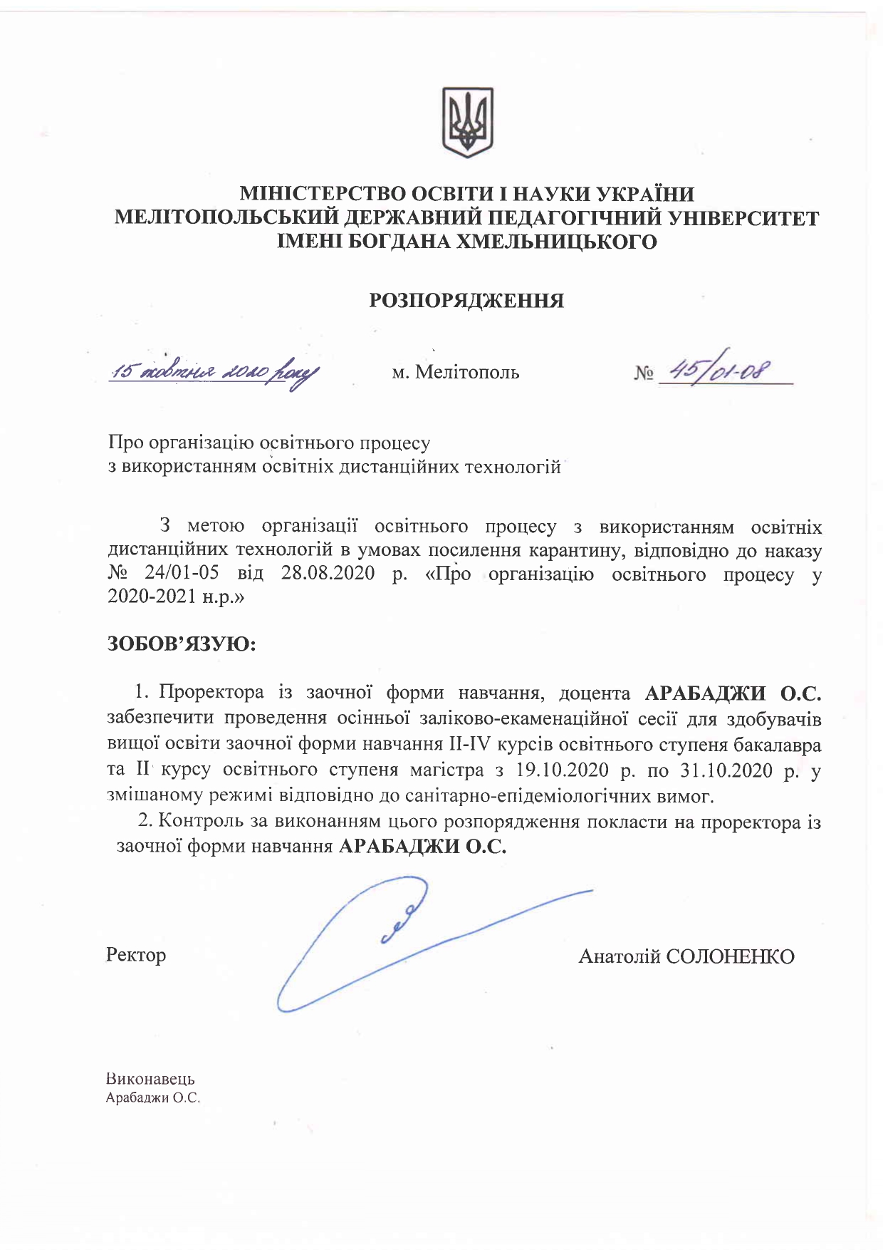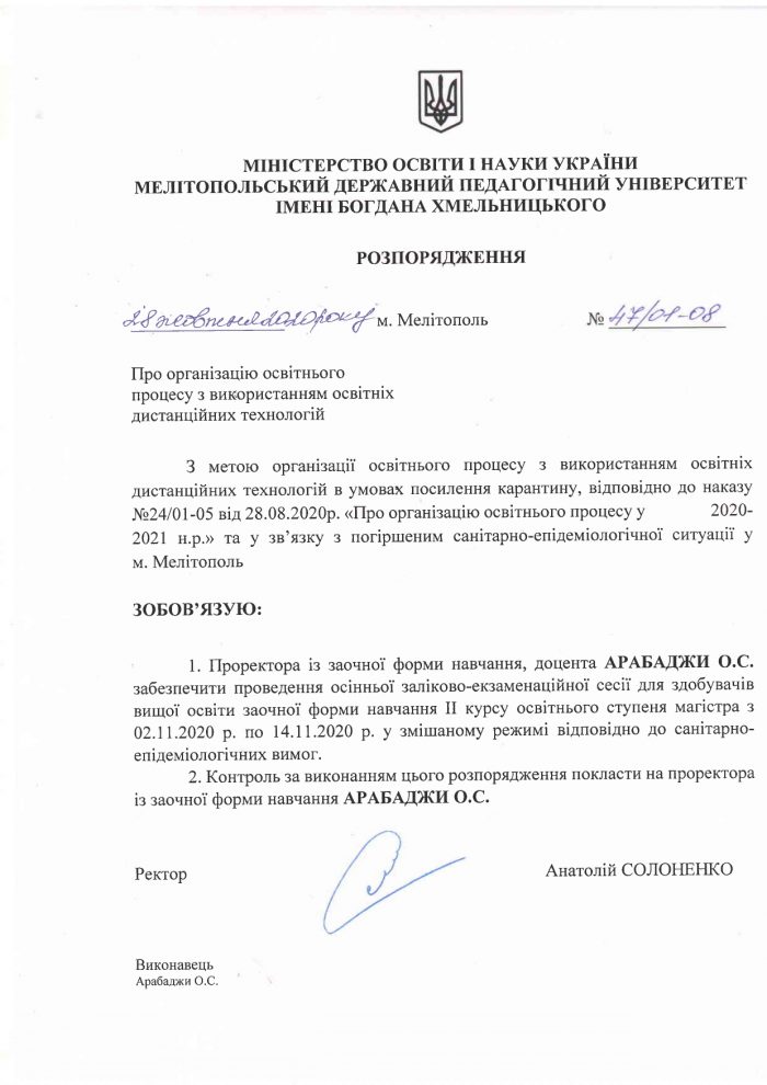 У зв’язку з погіршенням епідеміологічній ситуації у Мелітополі і переходом міста у помаранчеву зону та на виконання наказу ректора «Про організацію освітнього процесу з використанням освітніх дистанційних технологій» № 40/01-08 від 24.09.2020 р. проведення осінньої заліково-екзаменаційної сесії з 28.09.2020 по 31.10.2020 р. для здобувачів вищої освіти II – IV курсів бакалаврату буде здійснено з використанням технологій дистанційного навчання, а для здобувачів вищої освіти I курсів бакалаврату і магістратури у змішаному режимі: аудиторно – проведення лекційних, лабораторних, практичних (семінарських) занять у навчальних групах до 20 осіб, дистанційно – проведення лекційних занять у навчальних групах більше 20 осіб