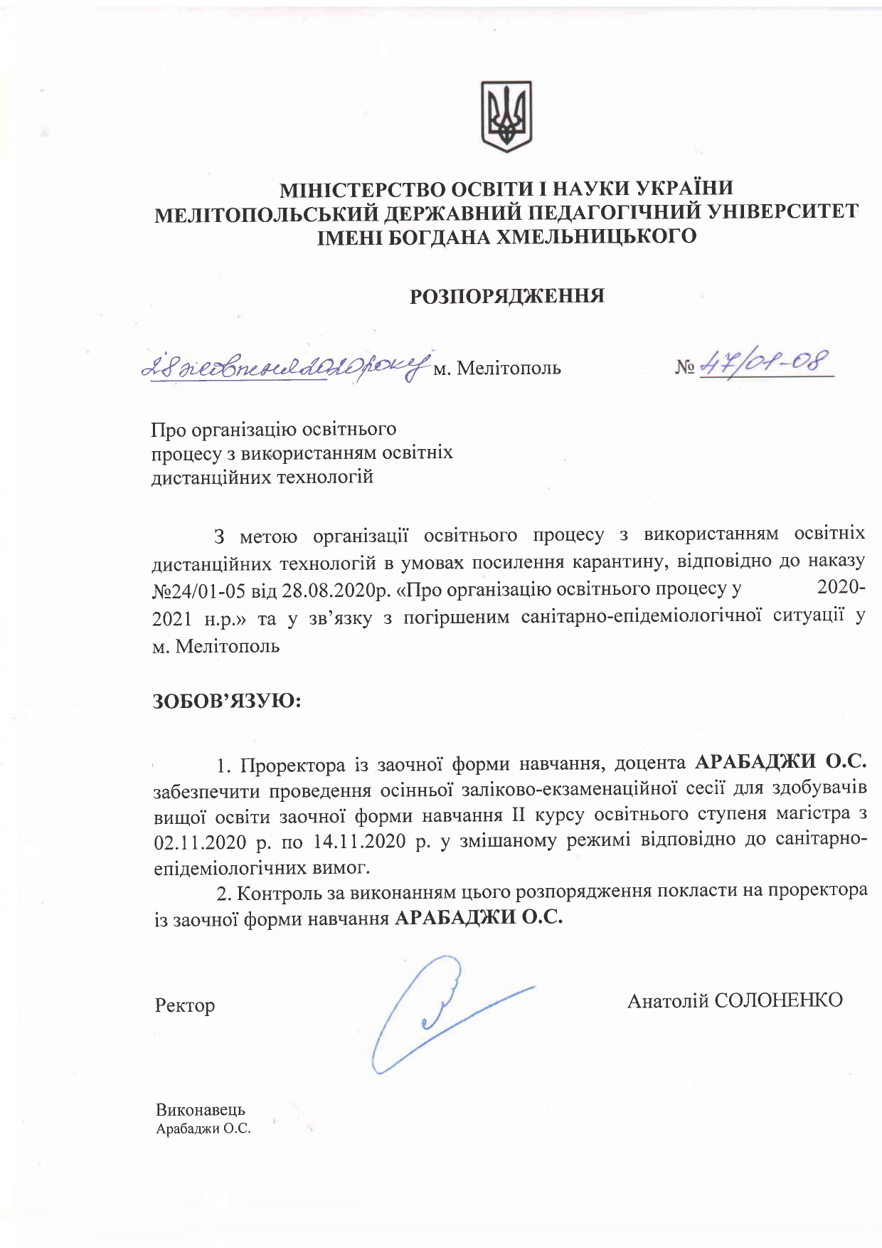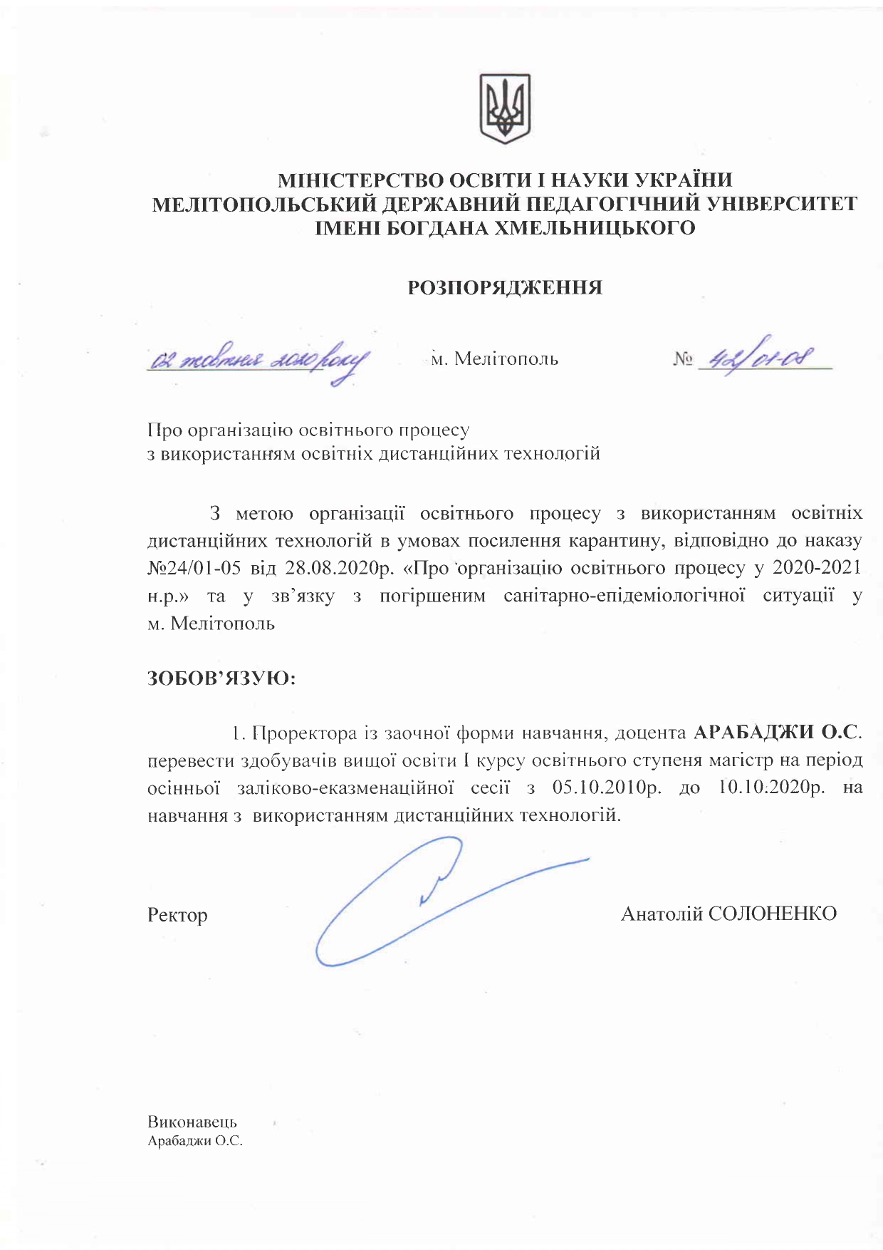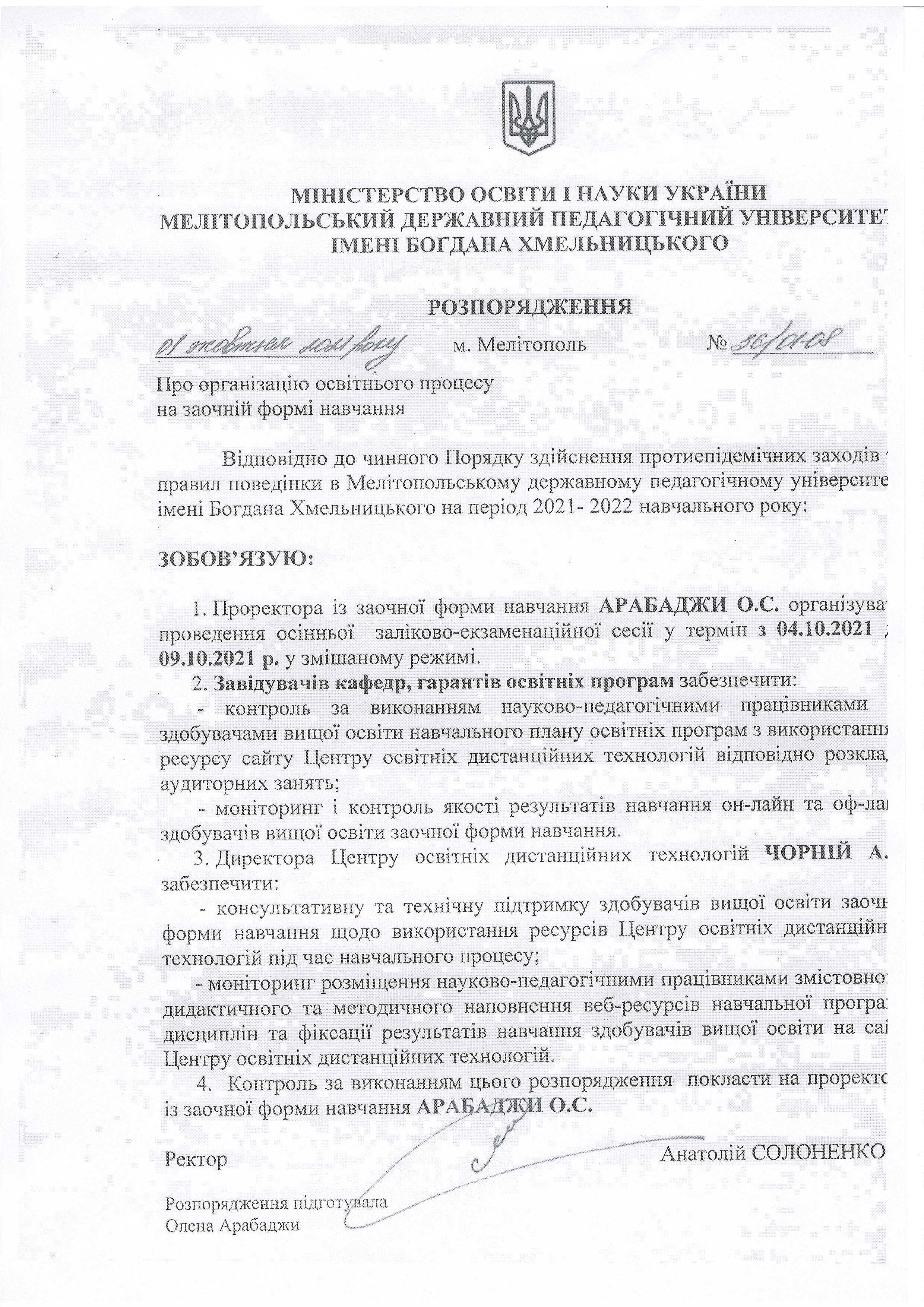 РОЗПОРЯДЖЕННЯ РЕКТОРА ПРО ОРГАНІЗАЦІЮ В УНІВЕРСИТЕТІ ОСВІТНЬОГО ПРОЦЕСУ З ВИКОРИСТАННЯМ ОСВІТНІХ ДИСТАНЦІЙНИХ ТЕХНОЛОГІЙ (Переглянути)