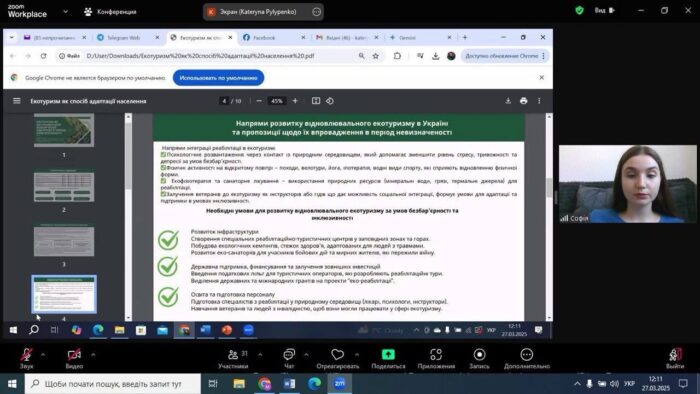 ✅👩🏼🎓Професорка кафедри Катерина Пилипенко наголосила на необхідності формування стратегії розвитку інклюзивного туризму, впровадження інноваційних механізмів у його функціонування та створення безбар’єрного простору для людей з обмеженими можливостями, особливо в умовах війни та у повоєнний період.