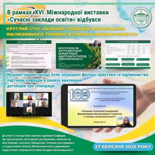 🏛️🇺🇦 27 березня 2025 року, в рамках XVI Міжнародної виставки «Сучасні заклади освіти», колективом кафедри економіки, готельно-ресторанного та туристичного бізнесу було організовано та проведено круглий стіл «Основні тенденції формування інклюзивного туризму в умовах невизначеності».