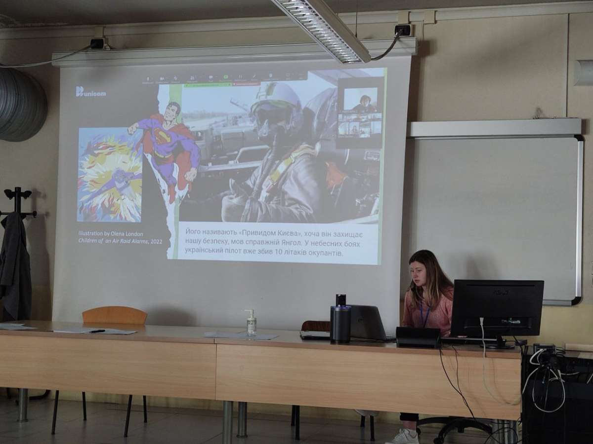 Надія Акулова присвятила свою доповідь візуальним практикам сьогодення, відображеним крізь призму війни, зокрема представила, яким чином сучасні реалії воєнного часу пронизують дитячу літературу, як автори апелюють до дитячої аудиторії, як ілюстрації в дитячих книжках системно і достеменно відображають суть війни як злочину проти людства.