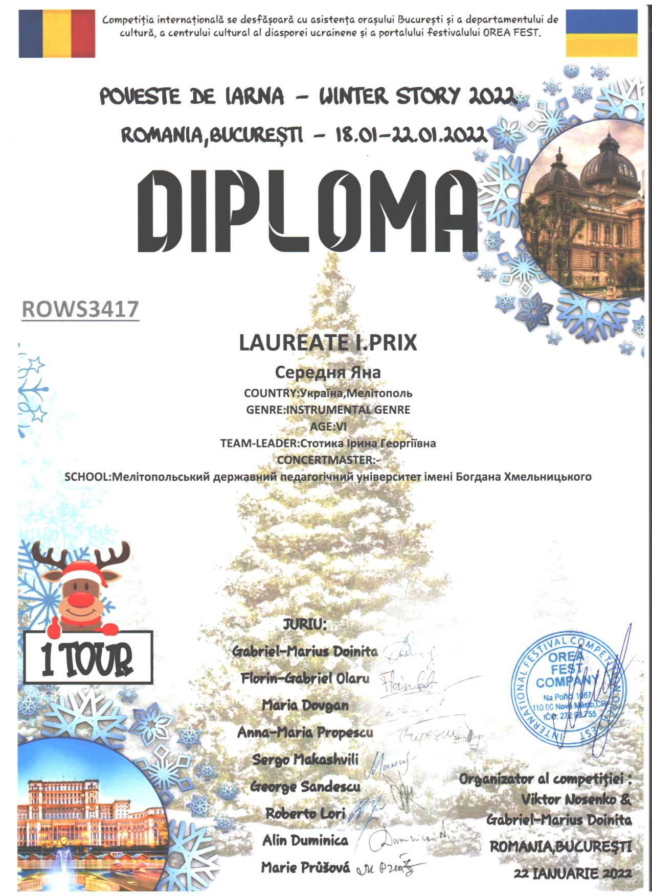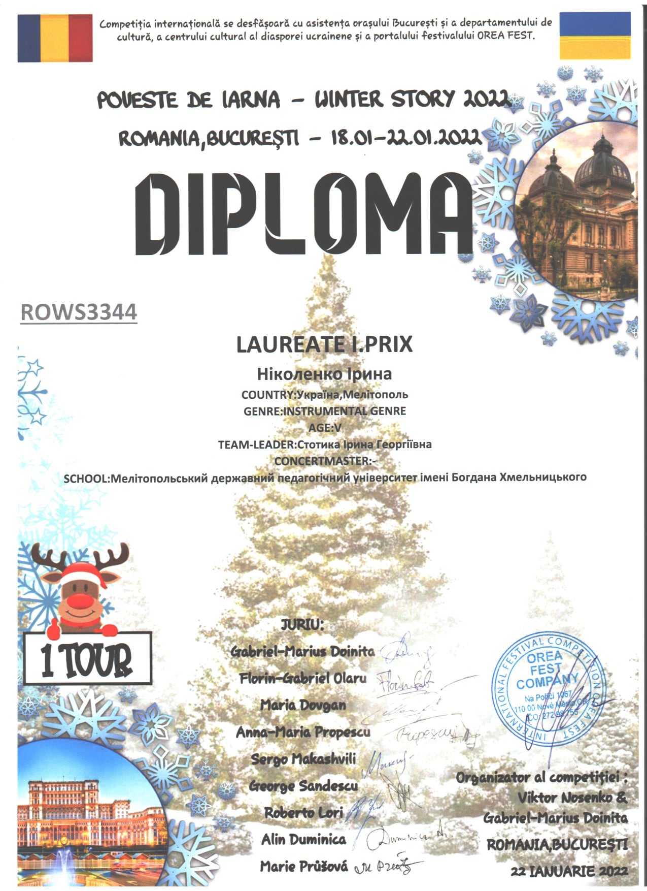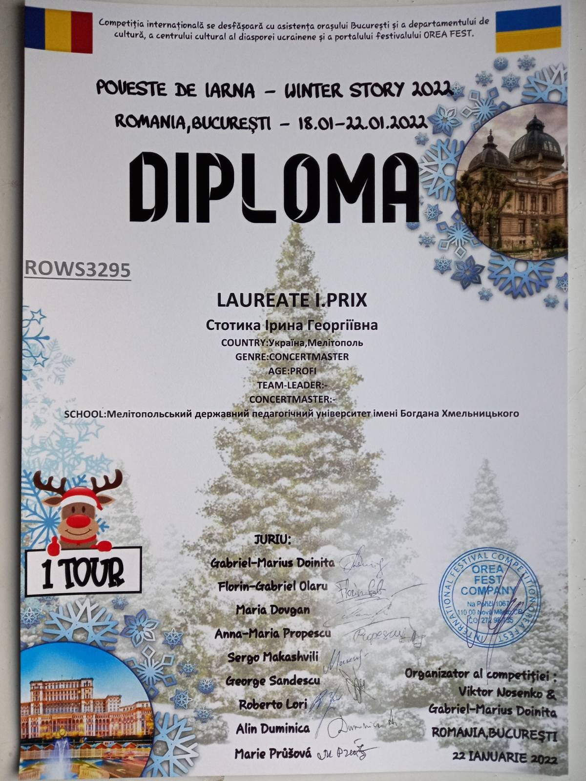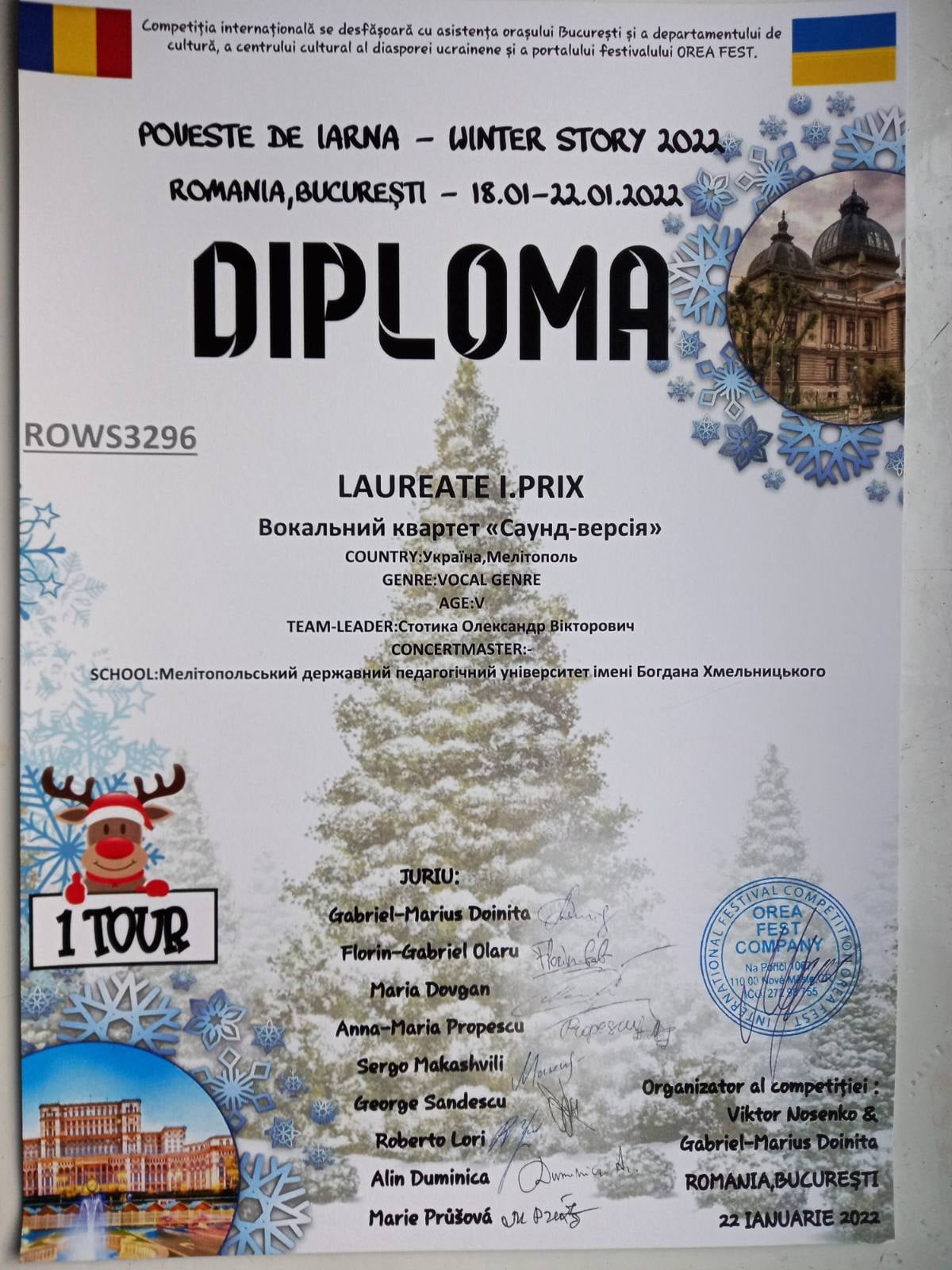 З 18 по 22 січня 2022 року в м.Бухарест (Румунія) проходив Міжнародний багатожанровий конкурс «WINTER STORY 2022».