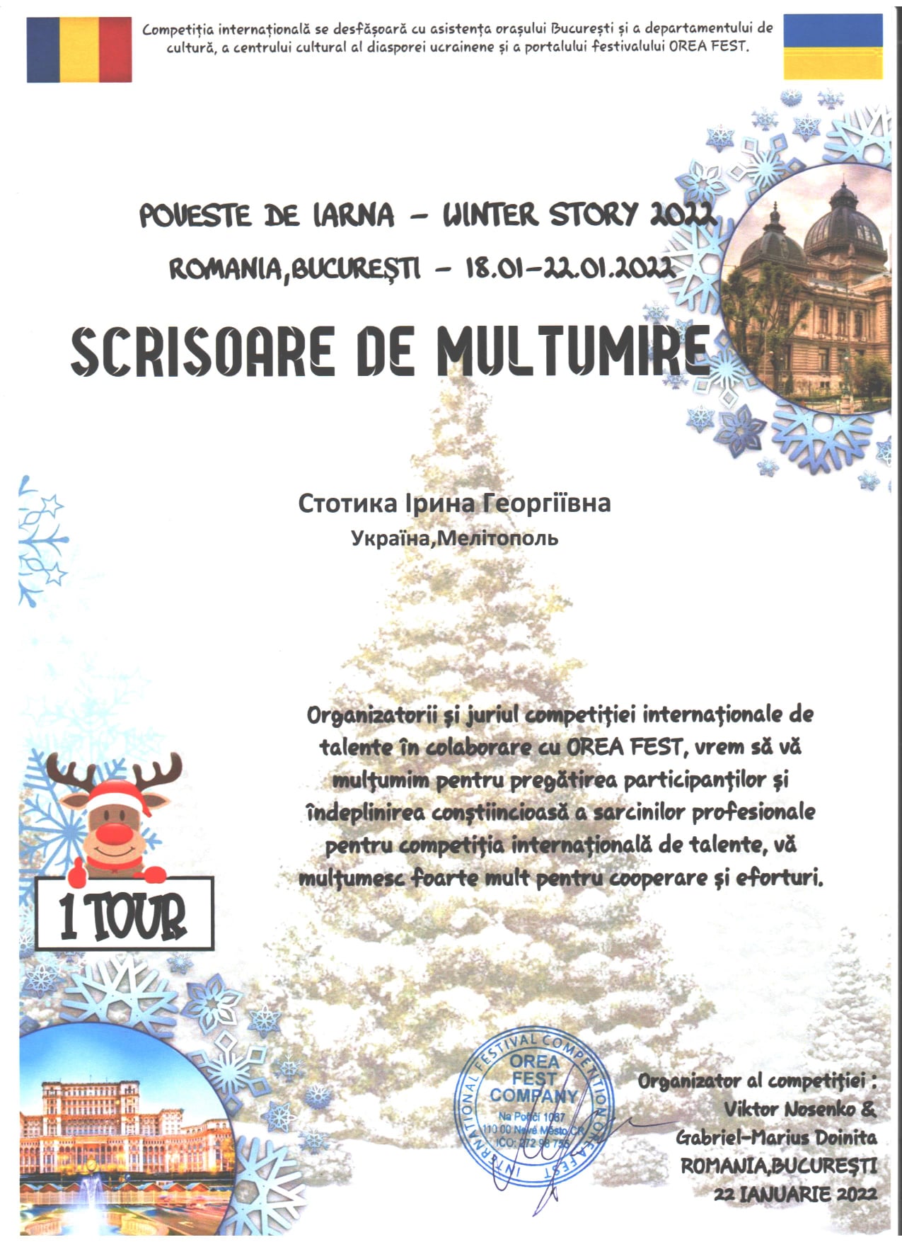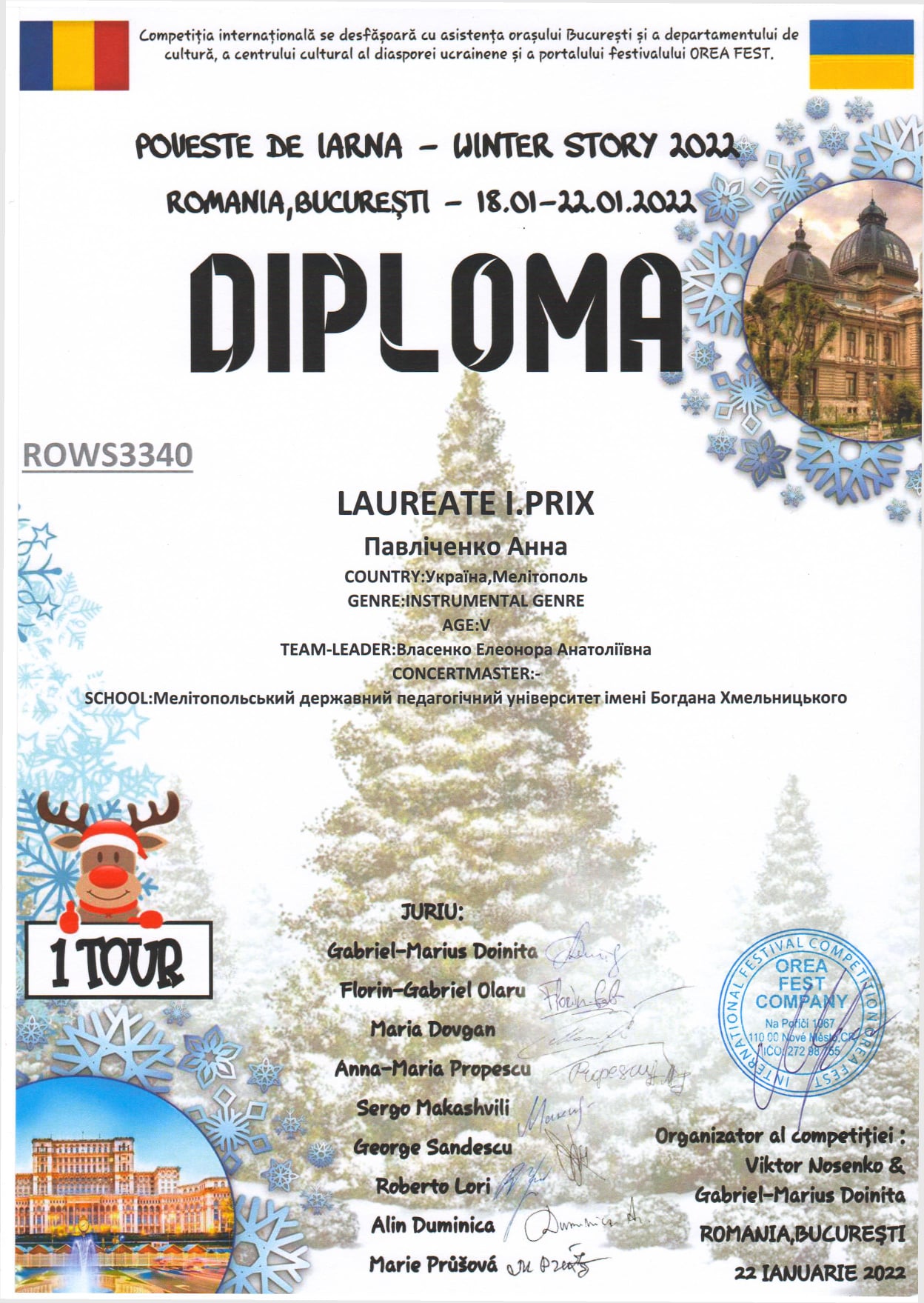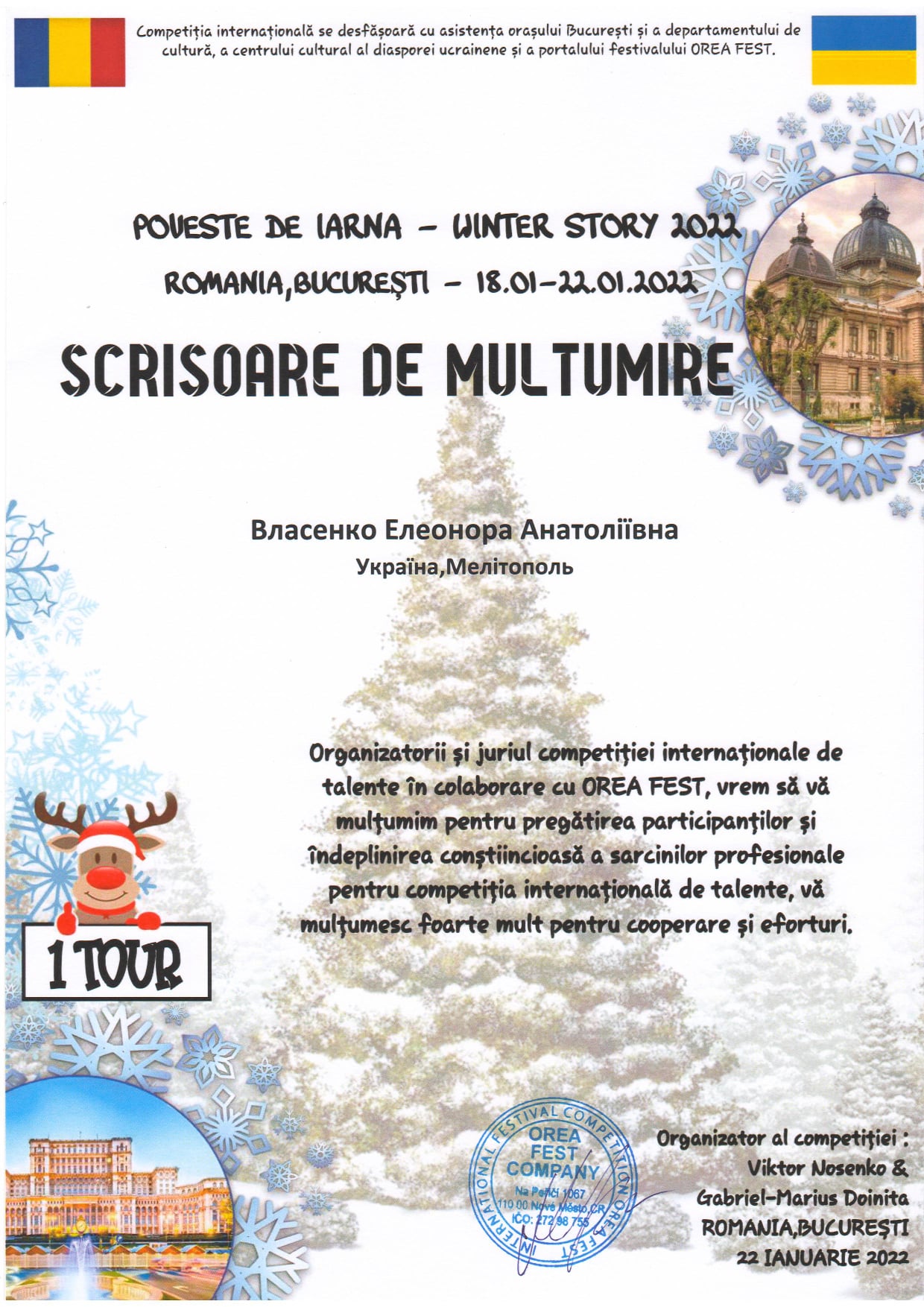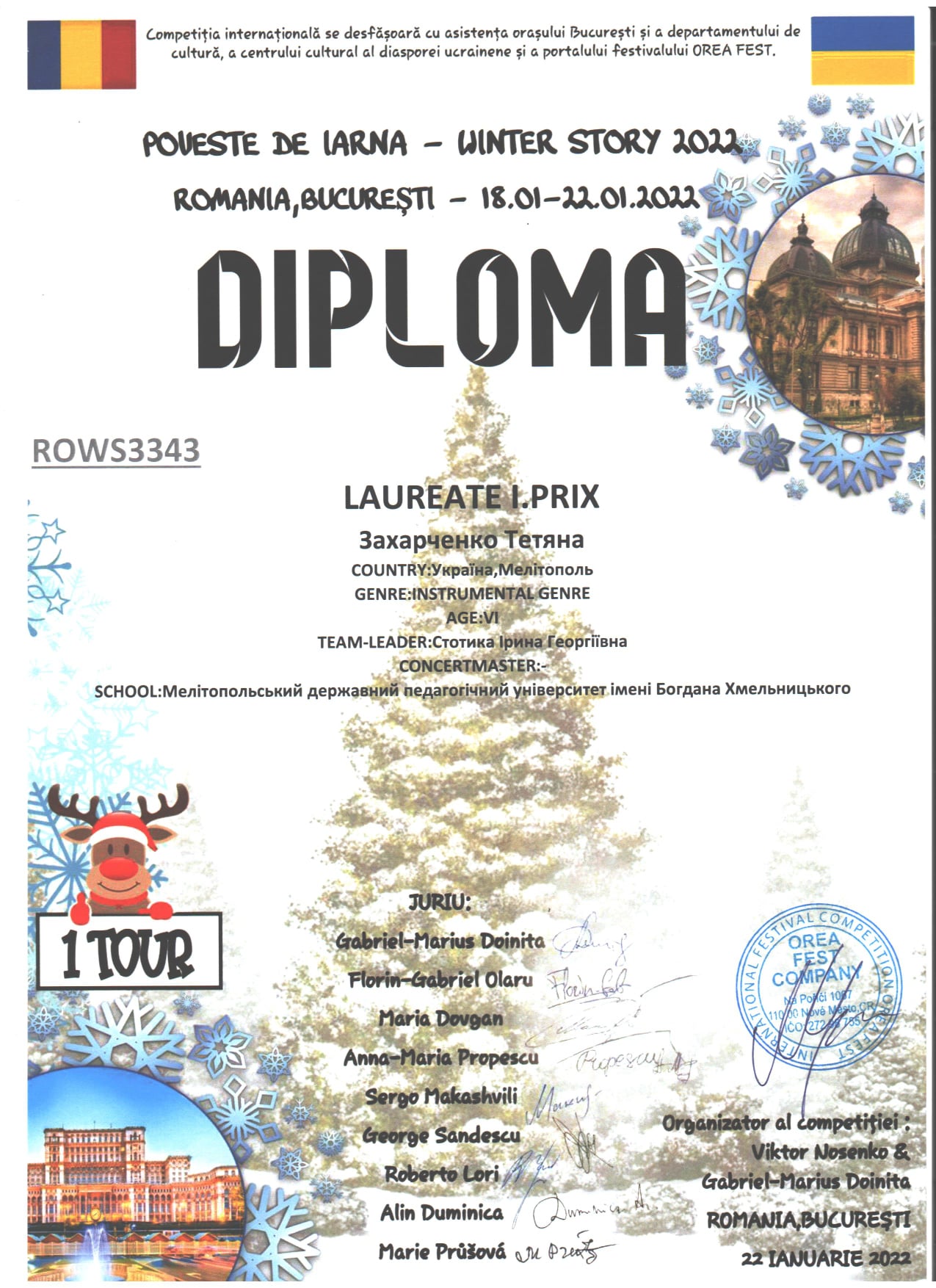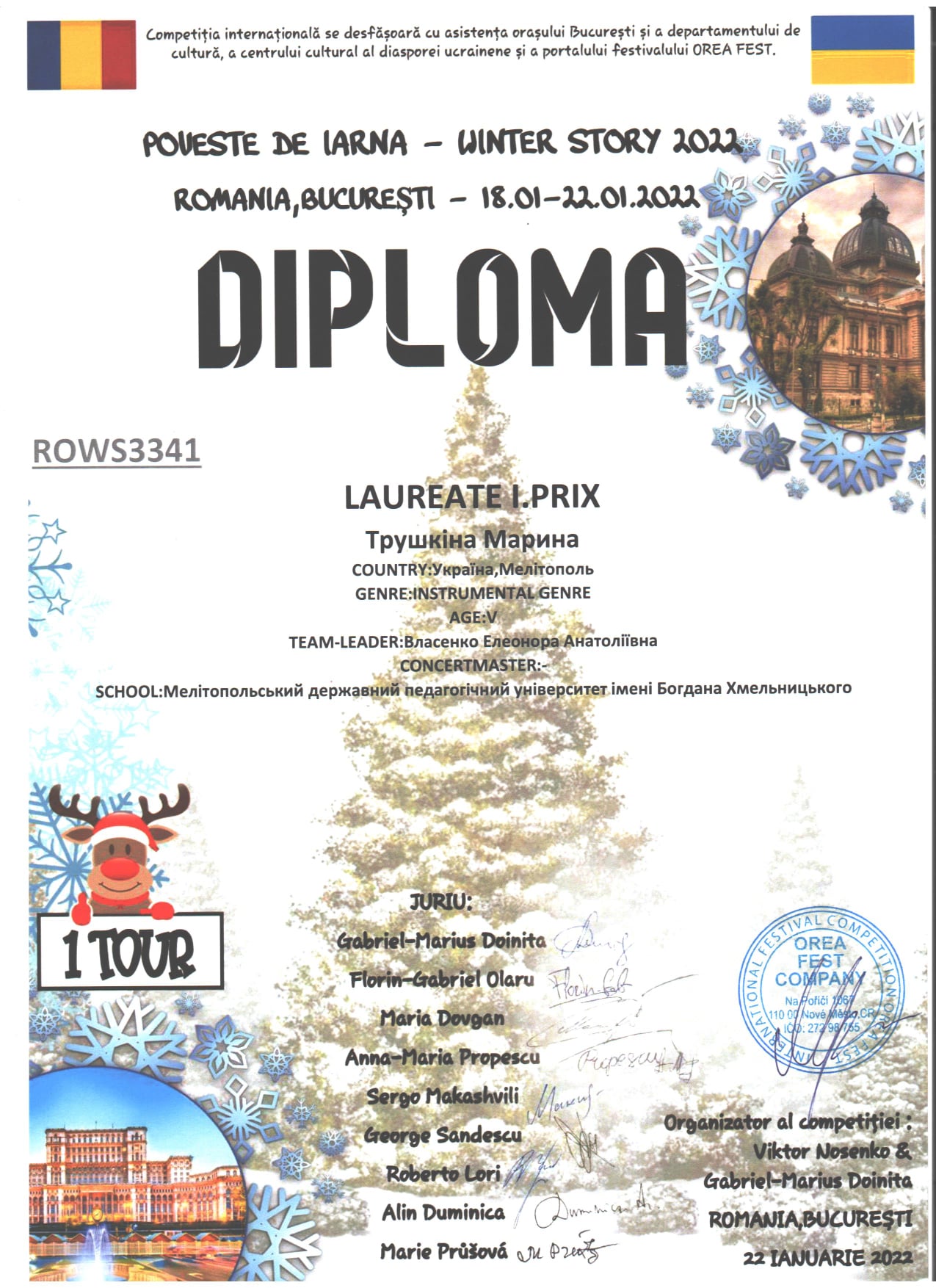 З 18 по 22 січня 2022 року в м.Бухарест (Румунія) проходив Міжнародний багатожанровий конкурс «WINTER STORY 2022».