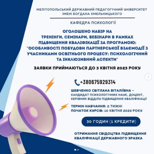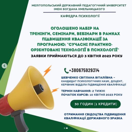 Кафедра психології Мелітопольського державного педагогічного університету імені Богдана Хмельницького оголошує набір на тренінги в рамках підвищення кваліфікації для викладачів, вчителів, психологів, педагогів закладів освіти всіх форм та рівнів за такими темами: