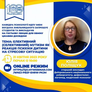 Кафедра психології 21 квітня о 10:00 запрошує стати учасником відкритої лекції Юлії Поліщук, старшого викладача Дніпровського національного університету, дефектолога, логопеда, медичного психолога.