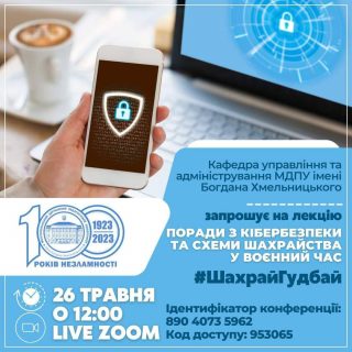 За ініціативи Національний банк України i ТАЛАН – центр фінансових знань Національного банку України в рамках участі в Марафоні Амбасадорів кампанії #ШахрайГудбай кафедра управління та адміністрування МДПУ імені Богдана Хмельницького запрошує на лекцію: «Поради з кібербезпеки та схеми шахрайства у воєнний час»!