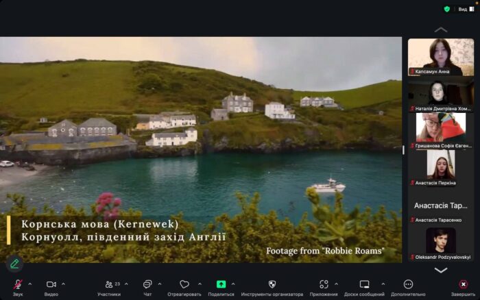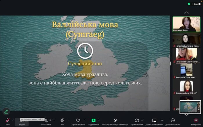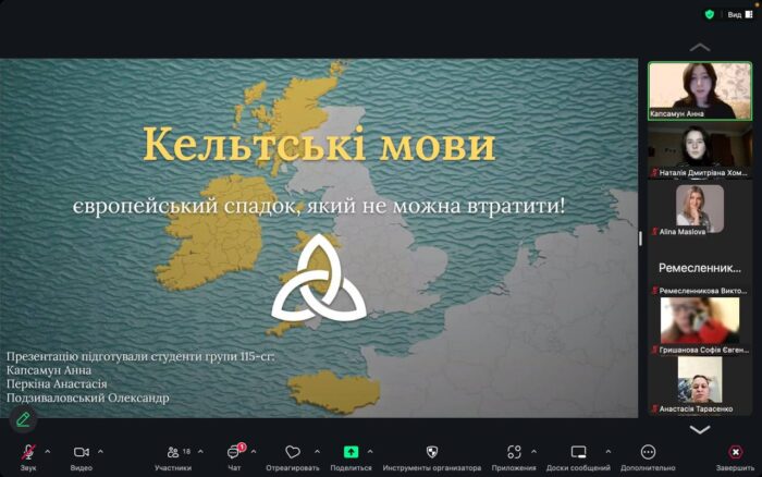 📌👩🏼💼Організатори заходу викладач-стажист Хоменко Наталія та студенти бакалавру групи 115-сг (Капсамун Анна, Перкіна Анастасія, Подзиваловський Олександр) ознайомили присутніх з класифікацією кельтських мов, звернули увагу на географію поширення кельтських мов, продемонстрували серію відео з мальовничими краєвидами та архітектурою місцевостей, звернули увагу на занепад деяких кельтських мов під тиском домінуючих європейських, наголосили на культурному значенні.