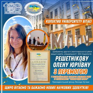Незламна освітянська родина Університету щиро вітає здобувачку другого (магістерського) рівня вищої освіти спеціальності 054 Соціологія МДПУ імені Богдана Хмельницького ОЛЕНУ РЕШЕТНІКОВУ та її наукових керівників доцента Людмилу Афанасьєву та професора Михайла Цюрупи
