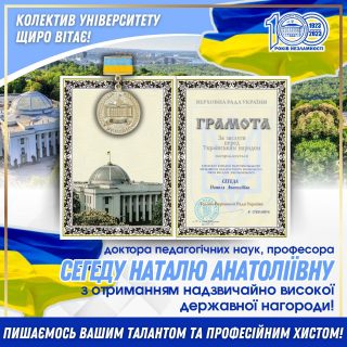 КОЛЕКТИВ УНІВЕРСИТЕТУ ВІТАЄ ПРОФЕСОРА НАТАЛЮ СЕГЕДУ З ОТРИМАННЯМ ГРАМОТИ ТА МЕДАЛІ ВЕРХОВНОЇ РАДИ УКРАЇНИ