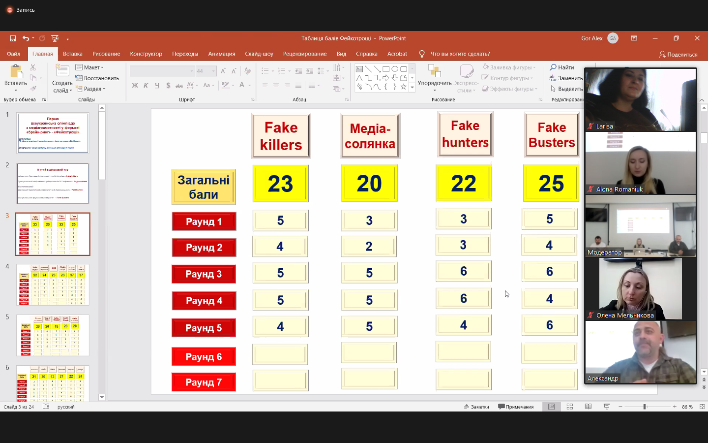 Команду «Fakehunters», яка посіла почесне 3-тє місце у півфіналі, представляли здобувач ІІІ курсу Родіон Скобліков (капітан), здобувачі І-го курсу – Єлизавета Прощенкова, Валерія Смолякова, здобувачі ІІ-го курсу – Анастасія Стрельніченко, Вікторія Множинська та здобувачка ІІІ-го курсу – Тетяна Колодіна. Куратором команди виступила викладач кафедри методики викладання германських мов Єпіфанцева Лариса Анатоліївна, яка готувала та супроводжувала команду, а також брала участь у ролі спостерігача під час змагань.