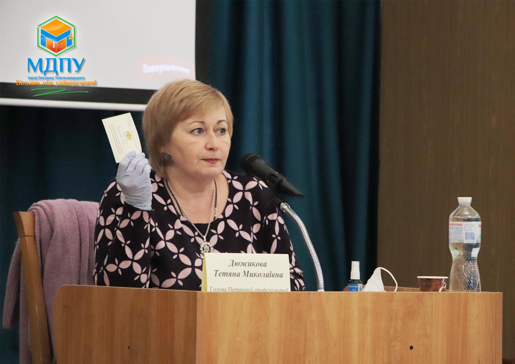 Головувала: Голова Первинної профспілкової організації університету, завідувач кафедри органічної і біологічної хімії, доцент Дюжикова Т.М.