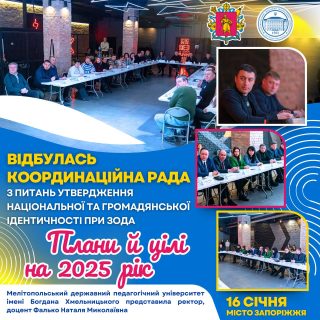 ✅🏛️16 січня 2025 року відбулося чергове засідання Координаційної ради з питань утвердження національної та громадянської ідентичності при Запорізькій обласній державній адміністрації. Захід зібрав представників обласної влади, академічної спільноти, громадських організацій, молодіжних ініціатив та ветеранів, які спільно працюють задля зміцнення українських цінностей.