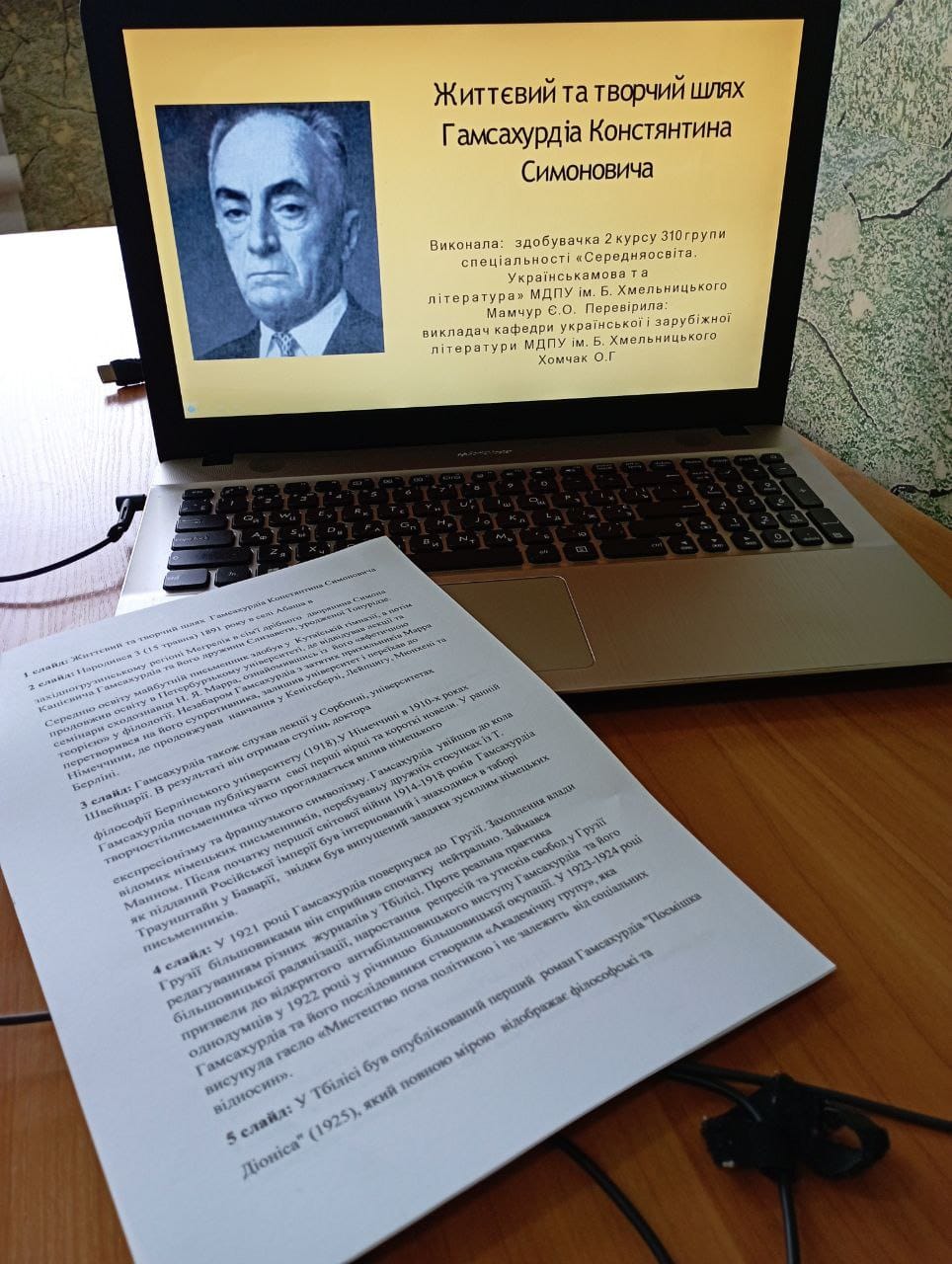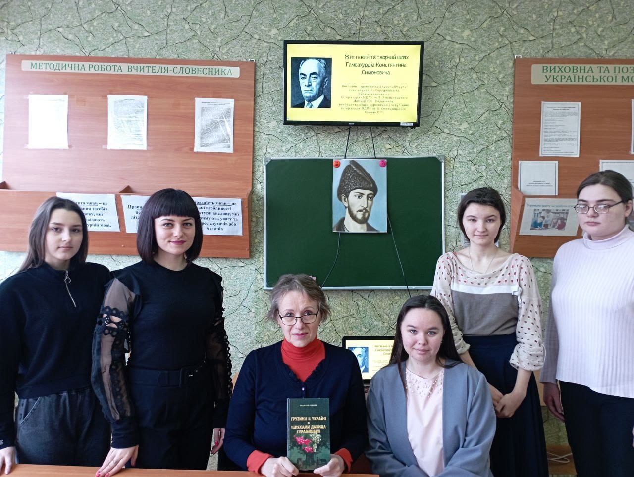 Мамчур Є., студентка 310/1-ф гр. підготувала презентацію на тему: «Шляхами письменника К. Гамсахурдіа». Дерман Ю., студентка 319/1 гр. проаналізувала вірш П. Тичини «Давид Ґурамішвілі читає Григорію Сковороді «Витязя в тигровій шкурі», а також продемонструвала відеоролік про те, як увічнена пам’ять про великих ґрузинів (Руставелі, Ґурамішвіли та ін.) в Україні.