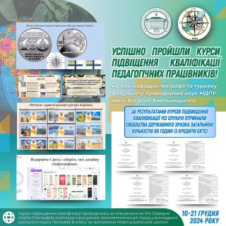 📚🙋🏻♂️З 10 по 21 грудня 2024 року на базі кафедри географії та туризму факультету природничих наук Мелітопольського державного педагогічного університету імені Богдана Хмельницького відповідно до наказу ректора №92/01-06 проводились курси підвищення кваліфікації педагогічних працівників за спеціальністю ‼️🗺️014 Середня освіта (Географія) освітньою програмою «Компетентнісний підхід у викладанні шкільного курсу географії 8 класу за програмою Нової української школи», в яких брали участь