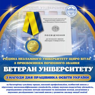 🇺🇦‼️За багаторічну сумлінну працю, високий професіоналізм, особистий внесок у підготовку висококваліфікованих спеціалістів, плідну науково-педагогічну діяльність, упровадження сучасних методів навчання та виховання молоді, досягнення у наукових дослідженнях і вагомий внесок у розвиток закладу вищої освіти почесне звання «Ветеран Університету» присвоєно: