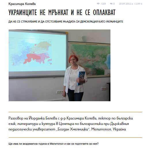 Інтерв’ю було присвячено ситуації в Україні та Мелітопольському державному педагогічному університету імені Богдана Хмельницького. Як розпочався навчальний рік для науково-педагогічних працівників і студентів? Як війна змінила наше життя? Як підтримують переселенців з України в Болгарії? Про все це можна прочитати за посиланням: (ПЕРЕГЛЯНУТИ).