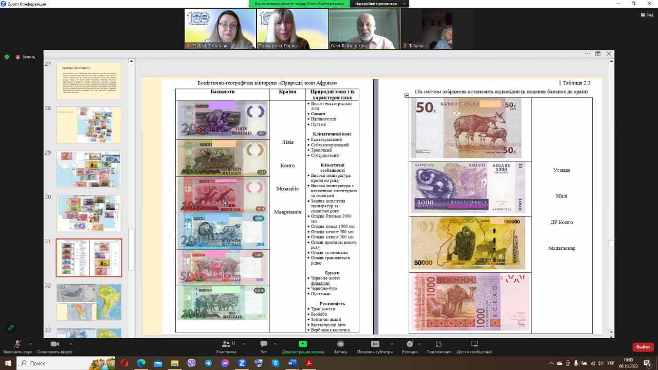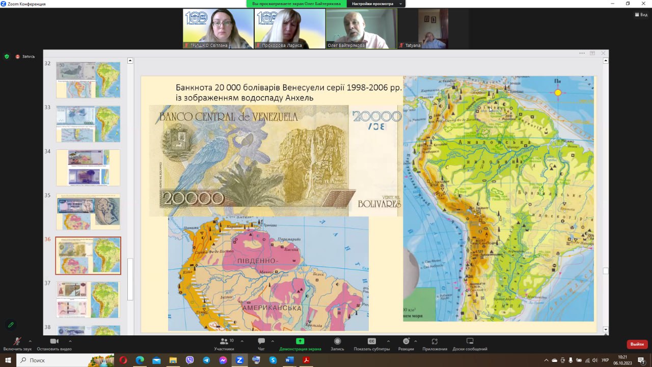 Другу частину заходу було присвячено методичним особливостям використання банкнот країн Африки, Південної Америки та Євразії для виявлення особливостей розташування, властивостей і причинно-наслідкових зав’язків рельєфу, корисних копалин, гідрографічних об’єктів, тваринного та рослинного світу цих материків. Також на прикладі застосування різноманітних банкнот учасники ознайомились із методичними аспектами формування навичок орієнтування на місцевості.