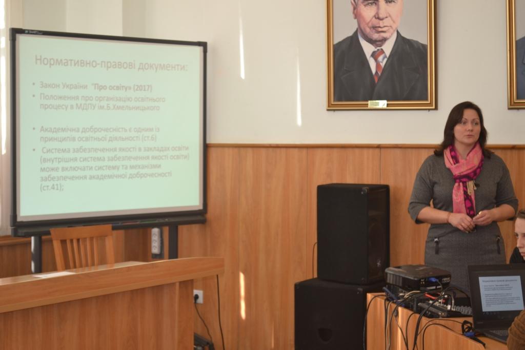 Проректор з наукової роботи Москальова Л.Ю. доповіла про питання академічної доброчесності в МДПУ імені Богдана Хмельницького, розкрила систему роботи університету у даній сфері. Професор кафедри педагогіки і педагогічної майстерності Елькін М.В. освітив питання «Педагогічна майстерність у вищій школі». Доцент кафедри української мови Пачева В.М. доповіла про деякі аспекти етики педагогічних комунікацій і культури мови. Доцент кафедри психології Шевченко С.В. обрала темою для обговорення «Саморегуляція, як критерій особистісно-професійного іміджу сучасного викладача вищої школи». Доцентом кафедри педагогіки і педагогічної майстерності Ізбаш С.С. було висвітлено питання «Морально-етичні засади у роботі викладача закладу вищої освіти».
