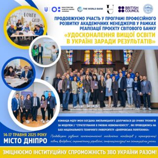 👥🇺🇦З 14 по 17 травня 2025 року команда у складі ректорки Наталі Фалько, першої проректорки Наталі Глебової, декана факультету фізичної культури, спорту та психології Андрія Проценка, декана факультету інформатики, математики та економіки Ернеста Муртазієва і керівниці Центру освіти дорослих Тетяни Коноваленко долучилася до очних тренінгів за Модулем 2 “Стратегування в умовах невизначеності”, які проводились на базі Національного технічного університету «Дніпровська політехніка».