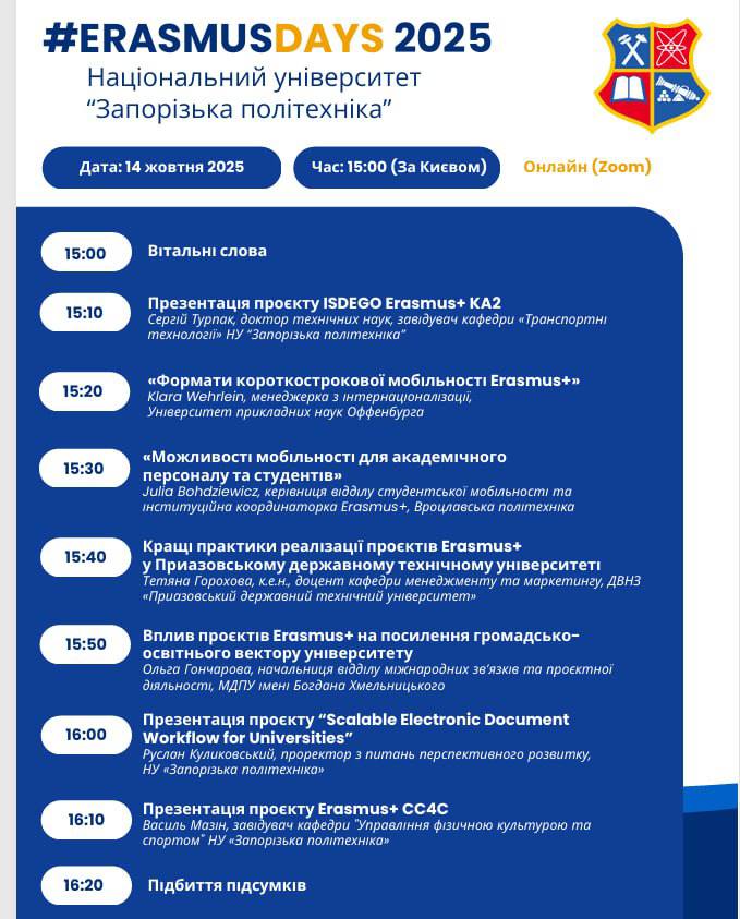 ✅🏛️ 14 жовтня 2025 року начальник Відділу міжнародних зв’язків та проєктної діяльності Ольга Гончарова представила МДПУ імені Богдана Хмельницького на заході ERASMUS Days 2025, який було організовано Національним університетом «Запорізька політехніка».