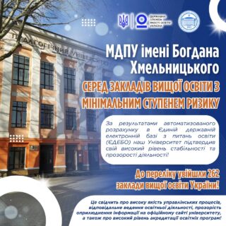 🇺🇦‼️ Результати оцінювання підтверджують: МДПУ імені Богдана Хмельницького стабільно залишається серед закладів вищої освіти з низьким ступенем ризику, що демонструє ефективність управління, системність у забезпеченні якості освіти та довіру державних інституцій до діяльності університету.