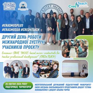 26 квітня відбувся другий день роботи міжнародної зустрічі учасників проєкту Erasmus+ CBHE “MOOC-based micro-credentials for teacher professional development” (CRED4TEACH), в якій взяли участь представники університету доцент Тетяна Коноваленко і доцент Альона Чорна.