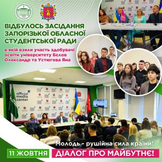 🙋🏼♂️🎯11 жовтня на базі Запорізького обласного центру молоді відбулося засідання Запорізької обласної студентської ради, в якій взяли участь здобувачі освіти університету Бєлов Олександр та Устюгова Яна.