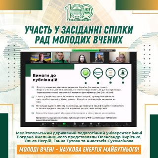 29 лютого 2024 року представники Ради молодих вчених Мелітопольського державного педагогічного університету імені Богдана Хмельницького Олександр Кирієнко, Ольга Негрій, Ганна Тутова та Анастасія Сухомлінова взяли участь у засіданні Спілки Рад молодих вчених.