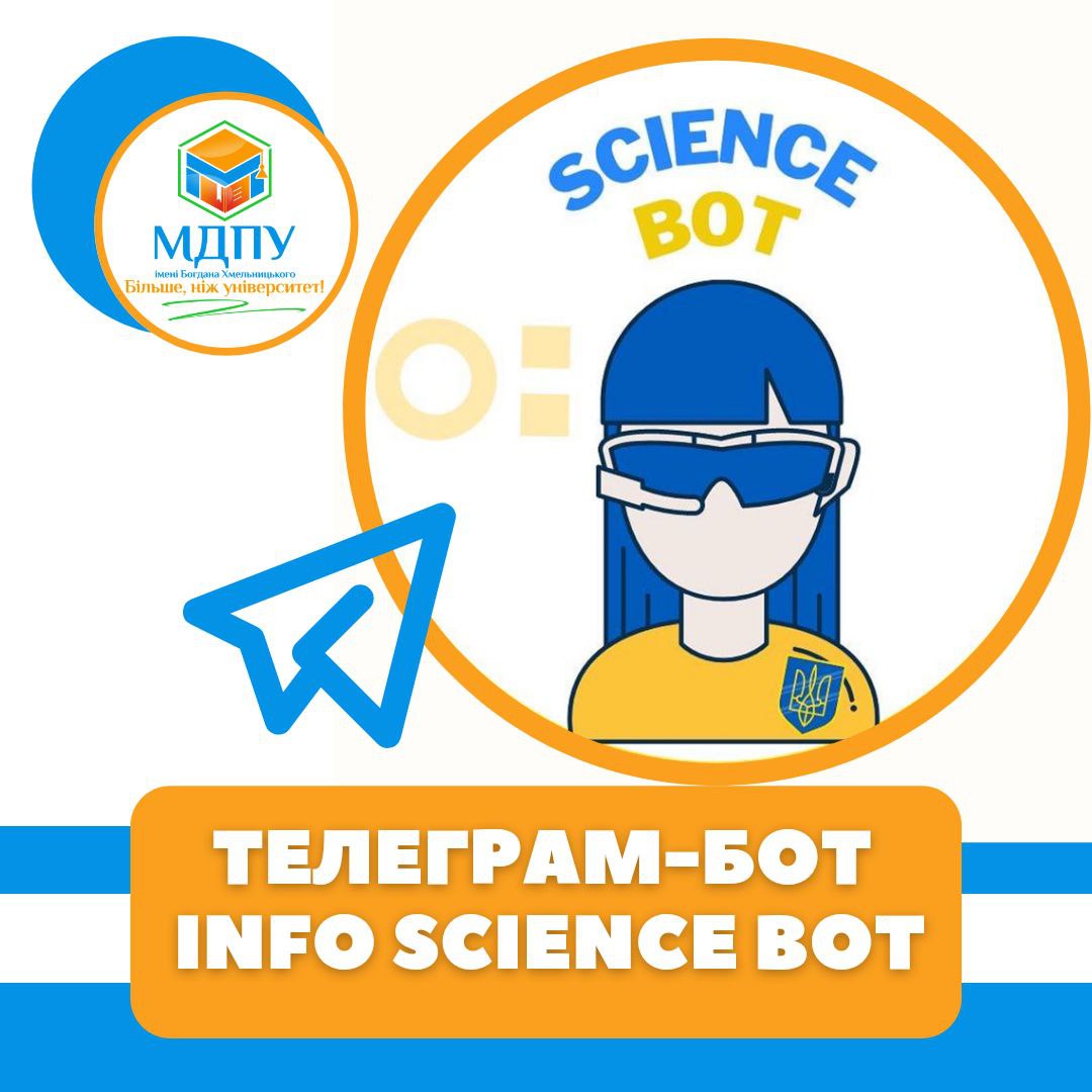 Для оперативного інформування науковців, інноваторів та стартапів про новини та можливості Міністерство освіти і науки України запускає Телеграм-бот Info Science Bot @InfoScienceBot.