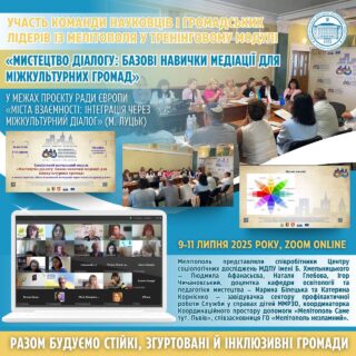 📆👥9–11 липня 2025 року команда науковців і громадських лідерів із Мелітополя взяла участь у тренінговому модулі «Мистецтво діалогу: базові навички медіації для міжкультурних громад», який реалізується у межах проєкту Ради Європи «МІСТА ВЗАЄМНОСТІ: інтеграція через міжкультурний діалог» (м. Луцьк).