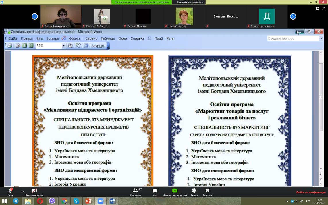 Представники кафедр соціології; інформатики і кібернетики; економіки та готельно-ресторанного бізнесу; математики і фізики; управління та адміністрування; прикладної математики та інформаційних технологій детально ознайомили вступників із спеціальностями та спеціалізаціями факультету. Про студентське життя учасники онлайн-заходу дізналися від куратора з організаційно-виховної роботи Муртазієва Е.Г.
