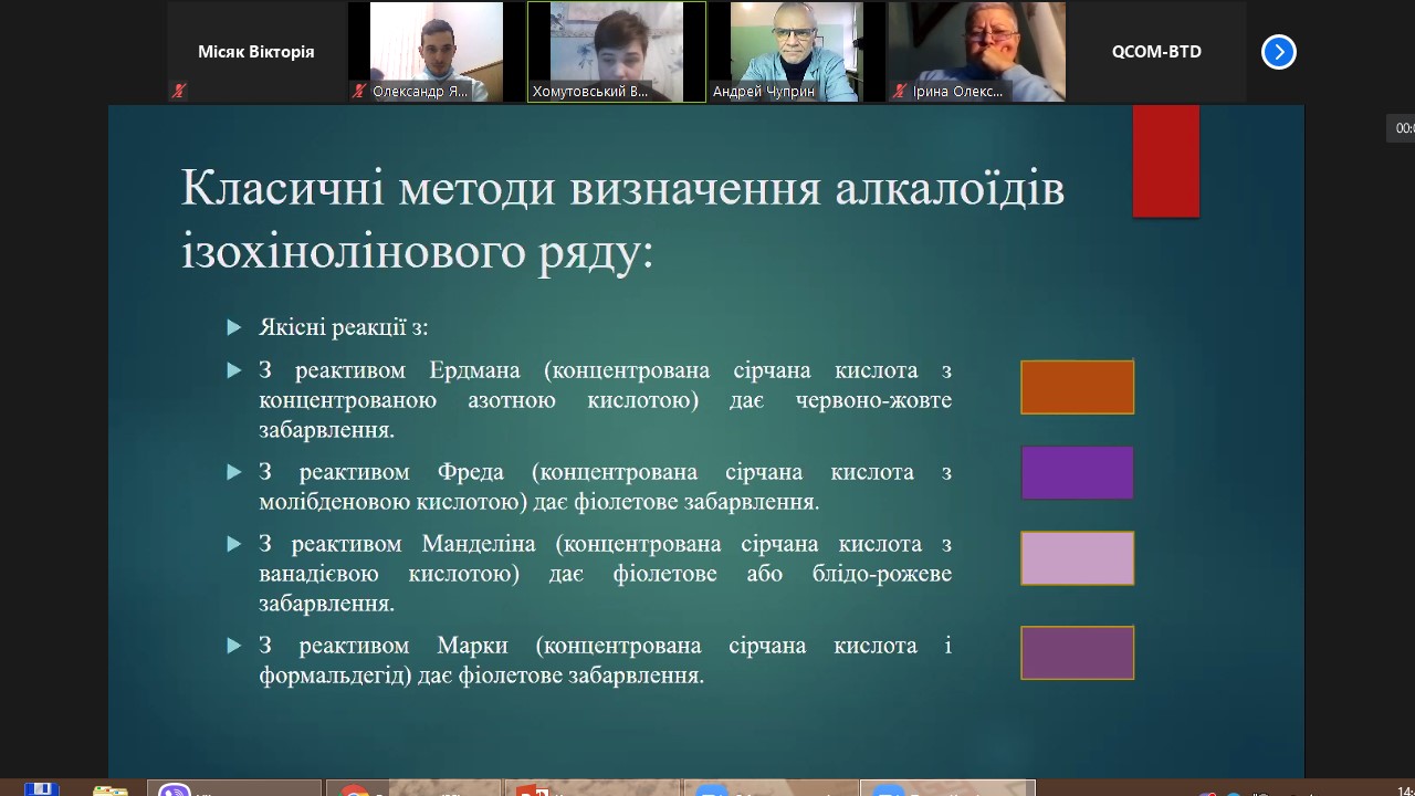 Від Мелітопольського державного педагогічного університету імені Богдана Хмельницького виступив студент магістратури спеціальності 014.05 СО Біологія Володимир Хомутовський, який зробив огляд літератури та розповів про сучасні методах ідентифікації алкалоїдів ізохінолінового ряду в біологічних об’єктах.