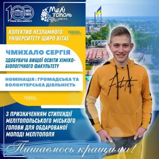 Родина незламного Мелітопольського державного педагогічного університету імені Богдана Хмельницького вітає здобувача вищої освіти ІV року навчання спеціальності 101 Екологія, хіміко-біологічного факультету ЧМИХАЛО СЕРГІЯ РОМАНОВИЧА з призначенням стипендії Мелітопольського міського голови для обдарованої молоді міста!