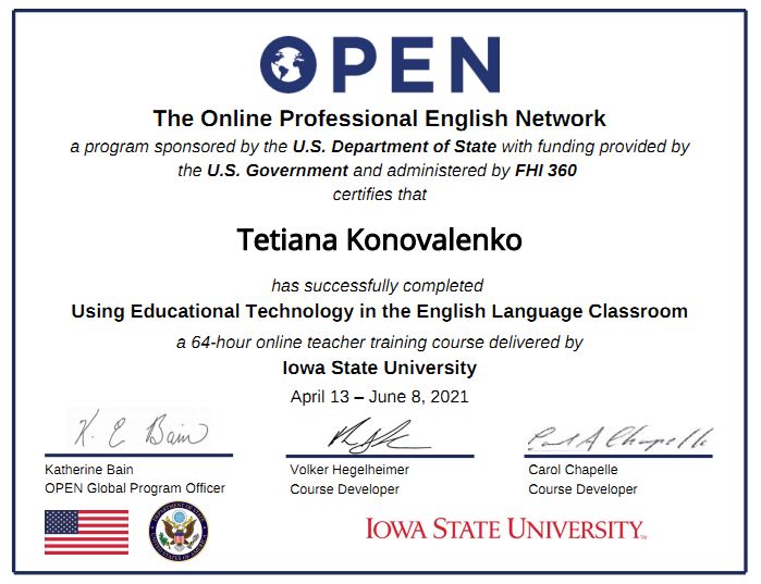 6 липня 2021 року декан філологічного факультету, доцент Тетяна Коноваленко отримала від Посольства Сполучених Штатів Америки в Україні сертифікат про успішне завершення 64-годинного онлайн курсу «Використання освітніх технологій на заняттях з англійської мови» від Університету Штату Айова (США). Курс проходив з 13 квітня 2021 р. по 8 червня 2021 р.
