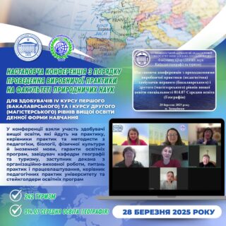 🏛📚28 березня 2025 року о 17:00 на платформі Zoom відбулася настановча конференція з порядку проведення виробничих практик для здобувачів IV курсу першого (бакалаврського) та І курсу другого (магістерського) рівнів вищої освіти денної форми навчання факультету природничих наук наступних спеціальностей: