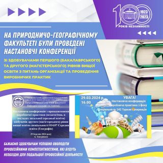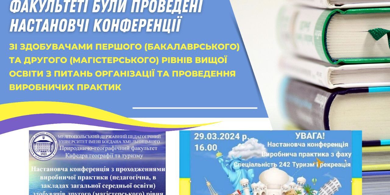 З 01 квітня по 10 квітня 2024 року здобувачі освітнього рівня бакалавр спеціальностей 014.07 Середня освіта (Географія), 014.11 Середня освіта (Фізична культура), 014.03 Середня освіта (Історія) проходять виробничу (педагогічну) практику, а здобувачі спеціальностей 242 Туризм, 081 Право та 232 Історія та археологія проходять практику (з фаху) з 01 квітня по 26 квітня 2024 року.