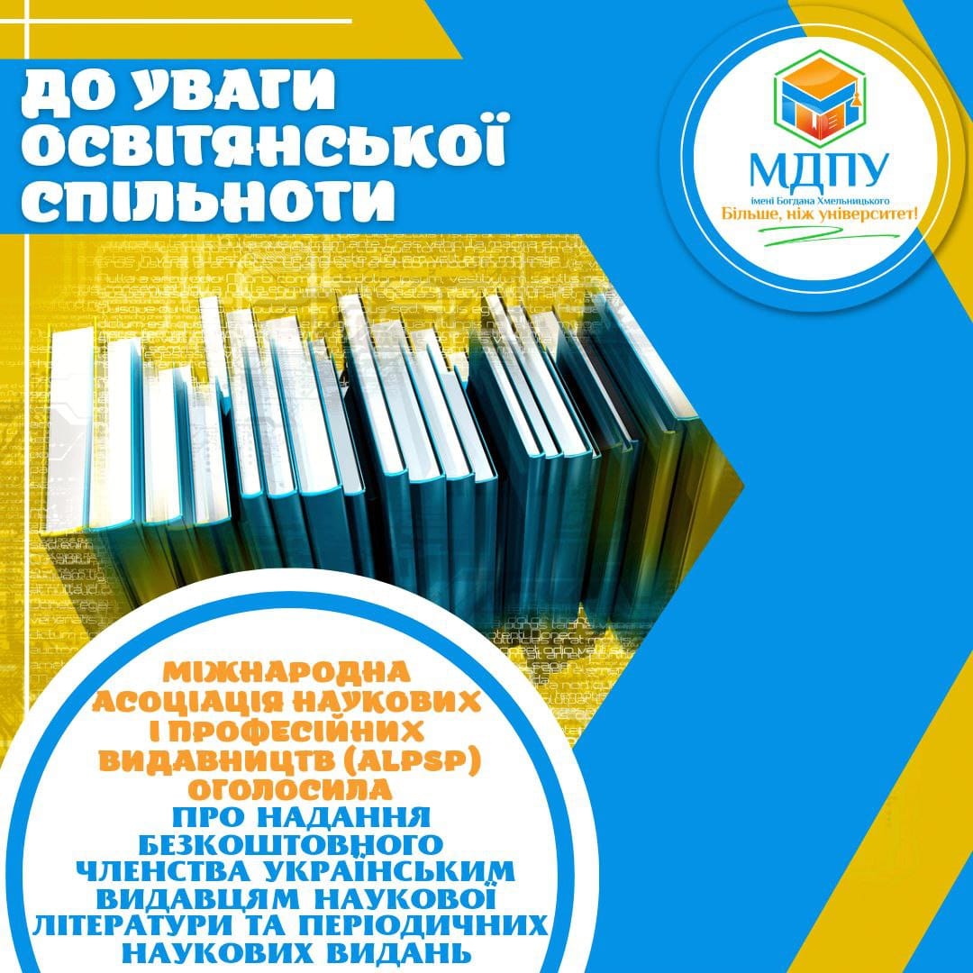 Міжнародна асоціація наукових і професійних видавництв (ALPSP) оголосила про надання безкоштовного членства терміном на один рік українським видавцям наукової літератури та періодичних наукових видань!