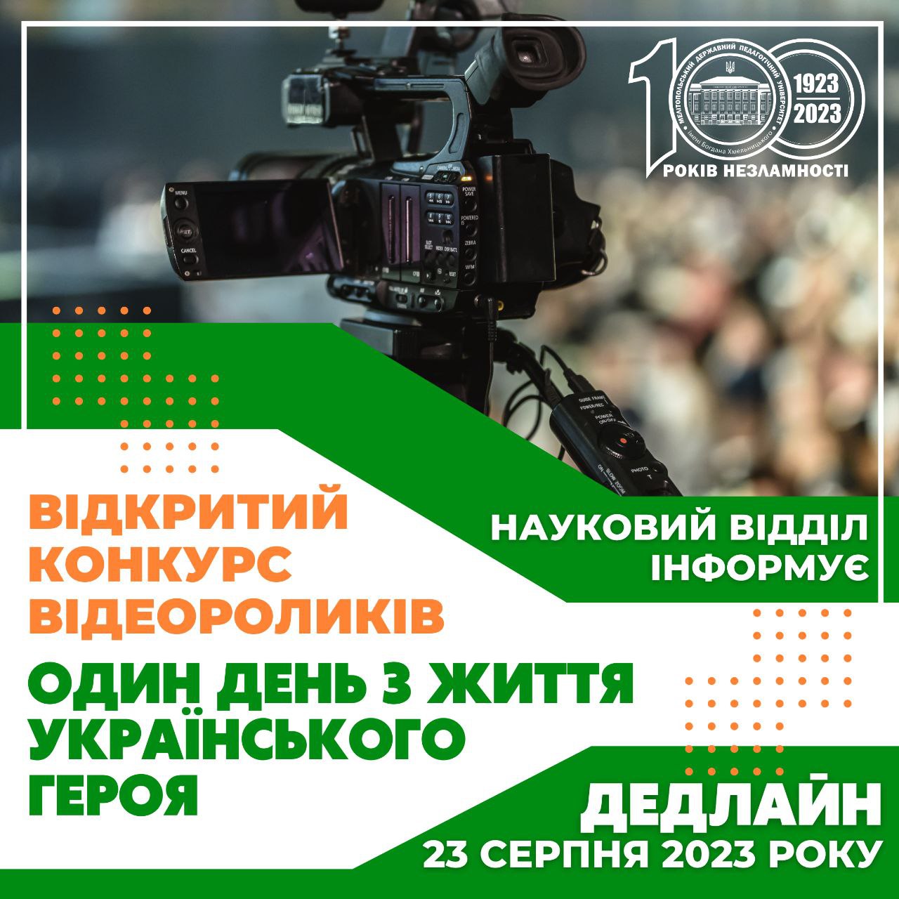 Запрошуємо представників закладів загальної середньої, професійної (професійно-технічної), фахової передвищої, позашкільної, вищої освіти та всіх зацікавлених осіб взяти участь у відкритому конкурсі відеороликів «Один день з життя українського героя».