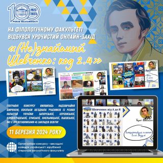 11 березня 2024 року з нагоди 210-річчя від дня народження Великого Кобзаря на філологічному факультеті відбувся урочистий онлайн-захід «(Не)знайомий Шевченко: код 2.4», який об’єднав поціновувачів творчого доробку митця – здобувачів загальної середньої, фахової передвищої та вищої освіти, вчителів і викладачів!
