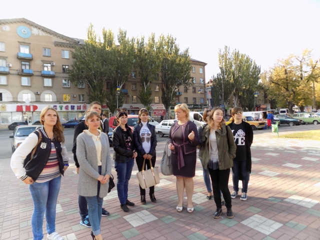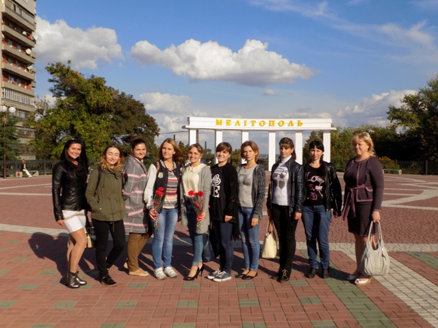 Біля пам’ятника Тарасу Шевченку Шарова  Т.М. розповіла студентам про його відкриття, про щорічні мовно-літературні конкурси імені Тараса Шевченка, які проводяться по всій Україні. Було акцентовано на тому, що пам'ятник зроблено в повний зріст. Він був відкритий в Мелітополі 22 травня 2011 року на центральній площі міста. Висота скульптури складає 2,2 метра. Поет зображений у русі, з книгою в руці. Пам'ятник виконаний зі світло-коричневого граніту з Токовського родовища Дніпропетровської області. Скульптура виконана коростишівським майстром Віталієм Рожиком. Постамент пам'ятника облицьований плитами полірованого червоного граніту.