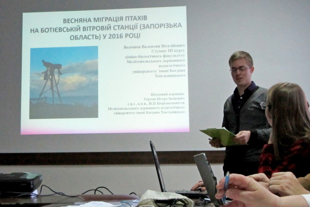 Стало гарною традицією запрошувати молодих науковців нашого університету до участі в міжнародній конференції «Біологія: від молекули до біосфери», яка щорічно проводиться в Харківському національному університеті імені В.Н. Каразіна. Цього року в ній узяли участь аспірант Сидоренко А.І., студенти ІІІ курсу хіміко-біологічного факультету Безушко Анастасія та Волошен Валентин, а також учениця 11 класу ЗОШ № 4 м. Мелітополь Горлова Анастасія. Наші молоді науковці підготували презентації результатів досліджень, проведених на базі ННЦ «Біорізноманіття». Валентин Волошен проаналізував весняну міграцію птахів у межах Ботієвської вітрової станції та запропонував методику оцінки впливу вітрових агрегатів на мігруючих птахів. Анастасія Безушко висвітлила комплекс раритетної орнітофауни Ботієвської ВЕС у розрізі представленості видів птахів у міжнародних природоохоронних списках. Прикладним аспектам була присвячена презентація Сидоренка Андрія та Горлової Анастасії, які за результатами проведених досліджень розрахували обсяги рибних запасів Азовського моря, що вилучаються найбільшою в Європі колонією баклана великого на косі Обитічній. Науковий керівник усіх досліджень, к. б. н., с. н. с. ННЦ «Біорізноманіття» Горлов П.І. був запрошений до складу кураторів секції «Зоологія».