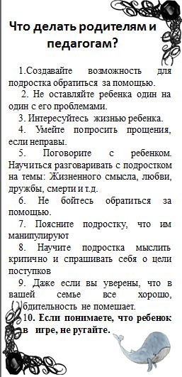 Також для цього заходу було підготовлено буклети, де було написано, що не можна та що треба робити, коли ви дізналися про участь підлітка у цій «грі». Наприкінці зустрічі організатори провели невеличкий тренінг, аби запобігти появі проблеми у житті студентів. Олеся Олексіївна та Ольга Ігорівна запропонували їм скласти список «10 причин, чому життя прекрасне» та «10 причин, чому я хороший». Також було наголошено на тому, що в Інтернеті існує деяка інтерпретація «Синього кита» – «Білий ведмідь». Ця гра також має 50 завдань, які навчать дитину бути самостійною, доброю та справжнім «скаутом».