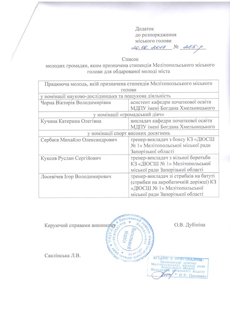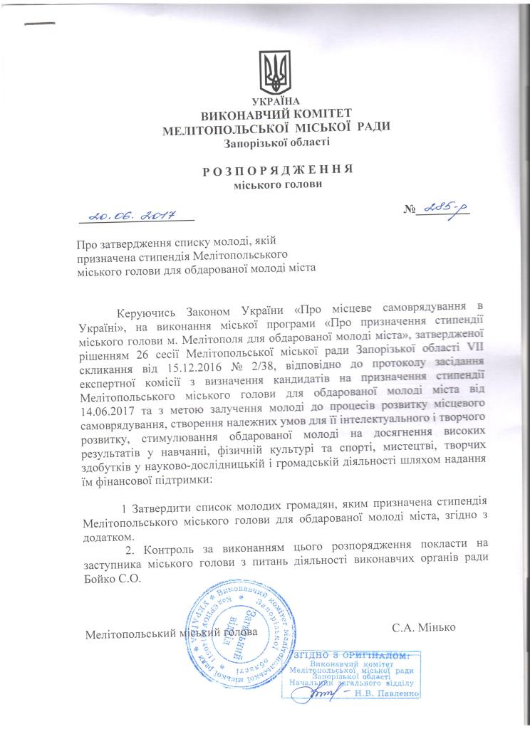 Відповідно до Розпорядження Мелітопольського міського голови від 20 червня 2017 № 285-р «Про затвердження списку молоді, якій призначена стипендія Мелітопольського міського голови для обдарованої молоді міста»: