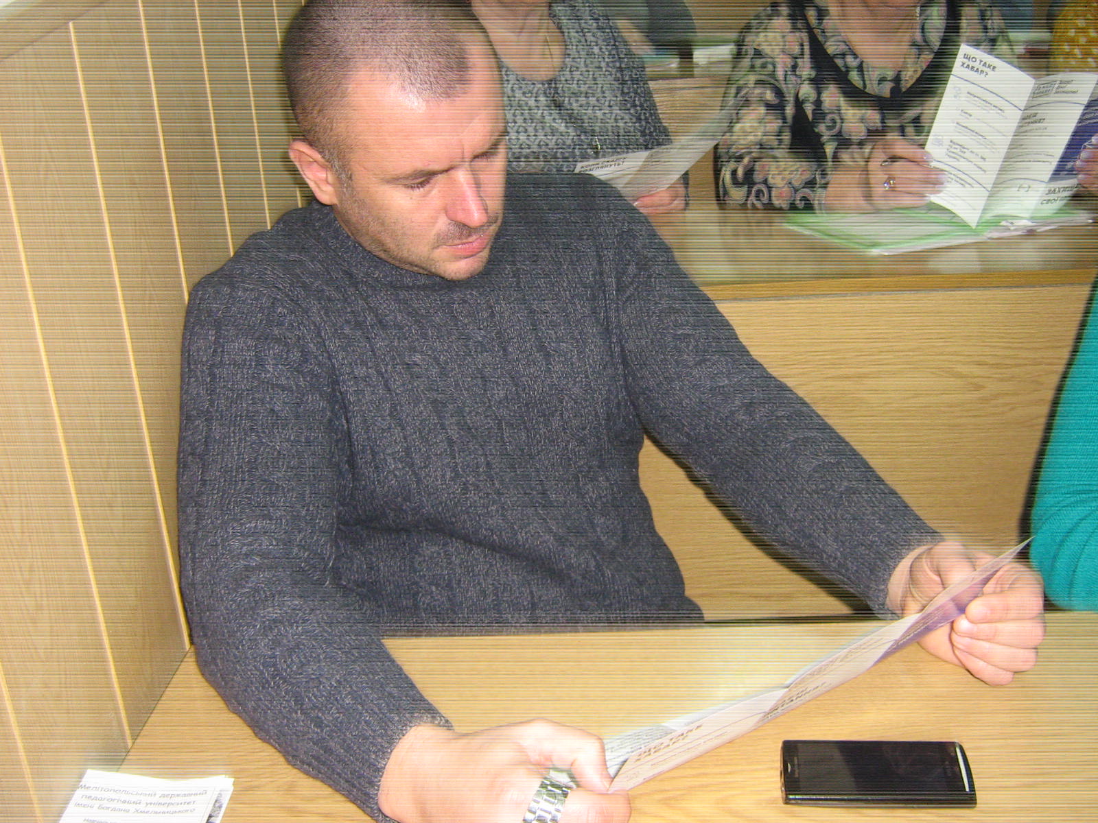 24 листопада 2017 року з працівниками хіміко-біологічного факультету Мелітопольського державного педагогічного університету імені Богдана Хмельницького обговорювались питання вирішення спорів (трудових, сімейних тощо) та захисту майнових прав.