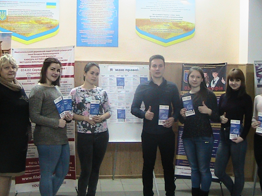 06 грудня 2017 року для працівників філологічного факультету Мелітопольського державного педагогічного університету імені Богдана Хмельницького проведено правоосвітній захід «Я МАЮ ПРАВО» під час якого обговорювались питання вирішення спорів (трудових, сімейних тощо) та захисту майнових прав.