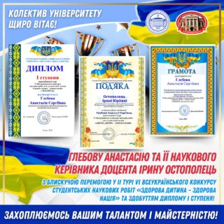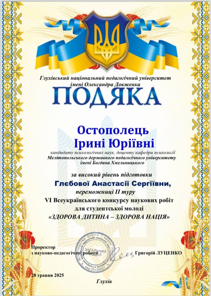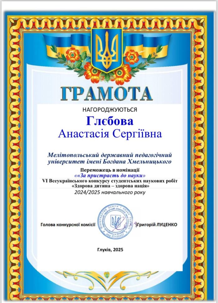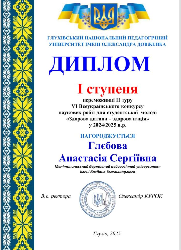 🏆🥳 Мелітопольський державний педагогічний університет імені Богдана Хмельницького щиро вітає Глебову Анастасію Сергіївну — студентку нашого університету, яка здобула ДИПЛОМ І СТУПЕНЯ та стала переможницею ІІ туру VI Всеукраїнського конкурсу студентських наукових «Здорова дитина – здорова нація» у 2024/2025 навчальному році!