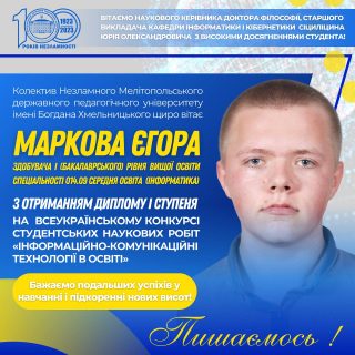 Маркова Єгора з отриманням диплому І ступеня на Всеукраїнському конкурсі студентських наукових робіт “Інформаційно-комунікаційні технології в освіті”, який проходив в Мелітопольському державному педагогічному університеті імені Богдана Хмельницького.