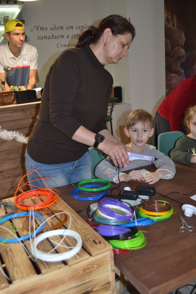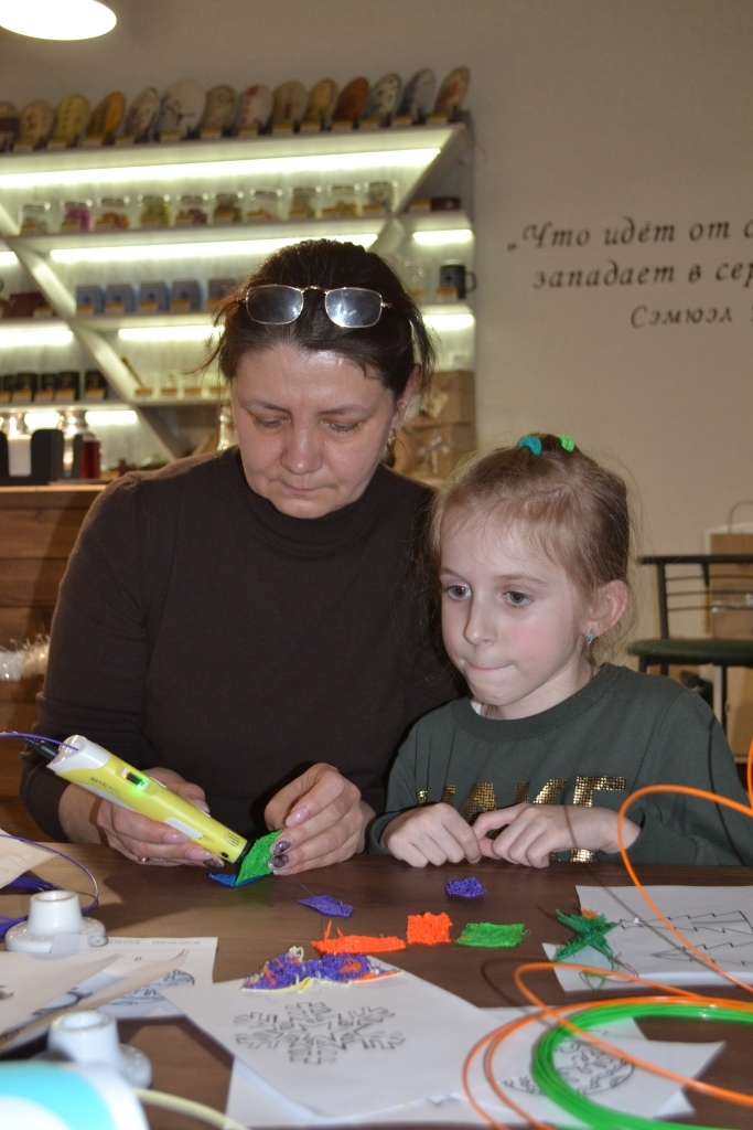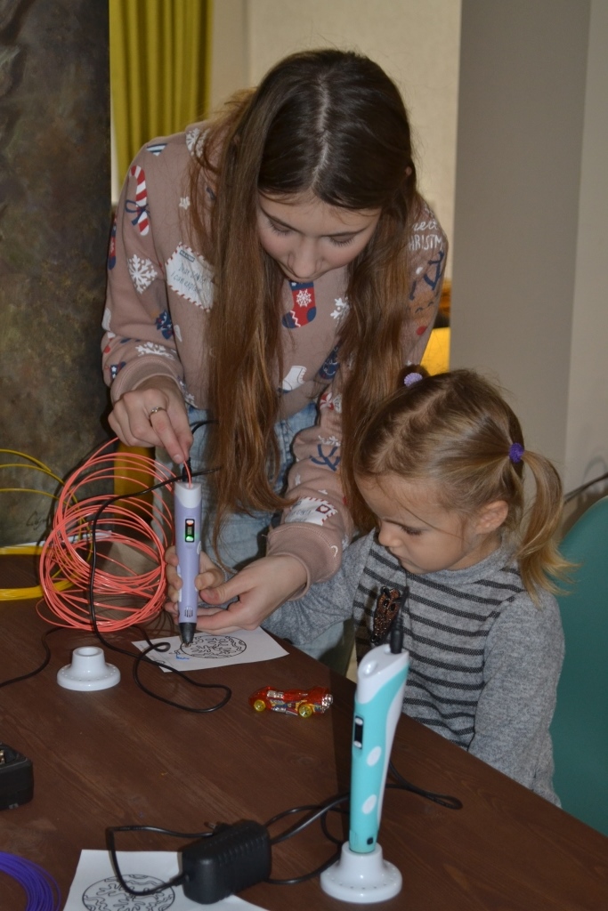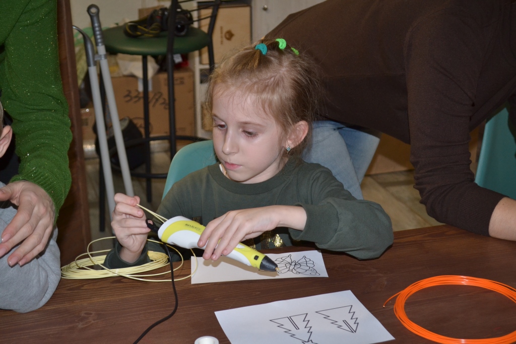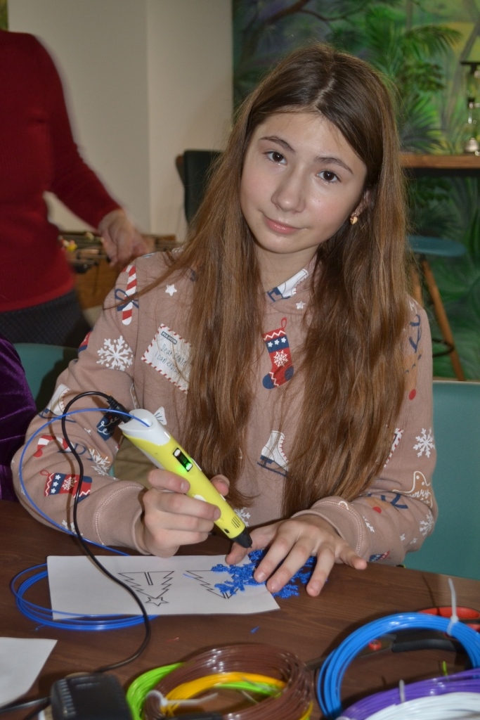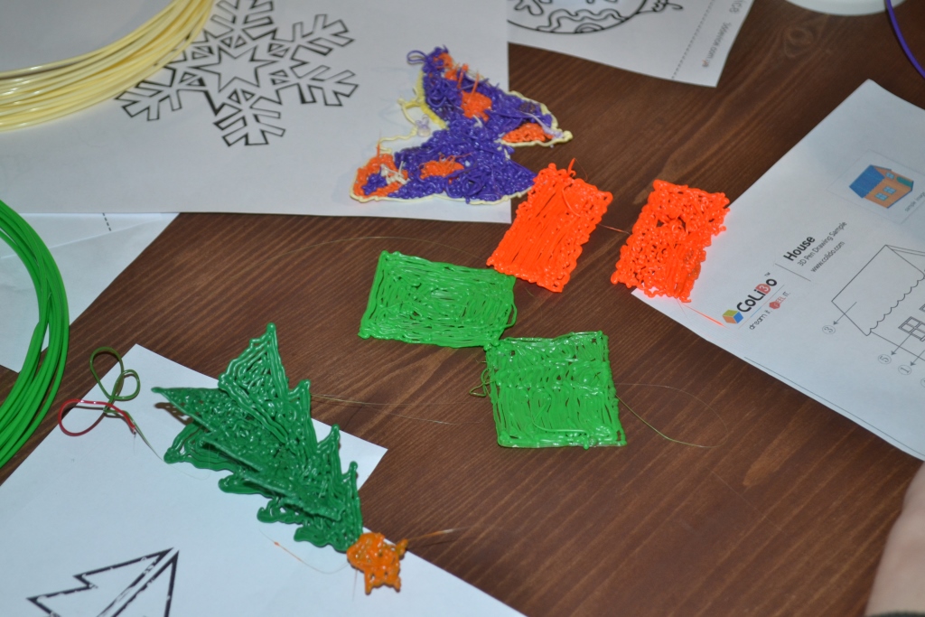 Серед 3d-шедеврів, створених учасниками майстер-класів, були як традиційні сніжинки, ялинки, ялинкові іграшки, так і казкові будиночки, символ Нового року – щур, власне придумане янголятко та ціла зимова картина.