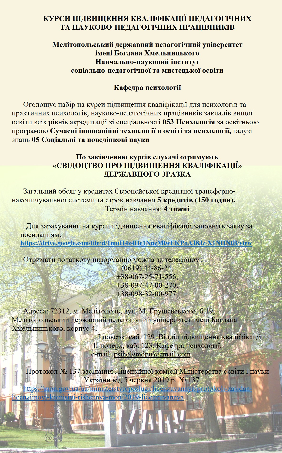 Оголошує набір на курси підвищення кваліфікації для психологів та практичних психологів, науково-педагогічних працівників закладів вищої освіти всіх рівнів акредитації зі спеціальності 053 Психологія за освітньою програмою Сучасні інноваційні технології в освіті та психології, галузі знань 05 Соціальні та поведінкові науки