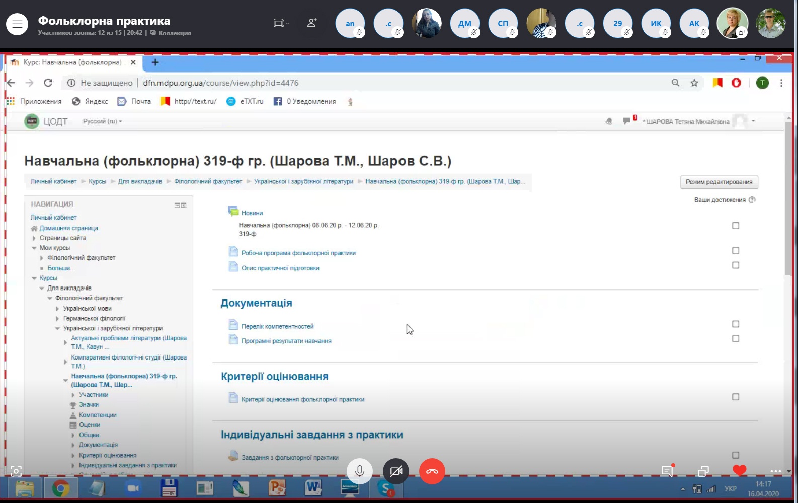 Керівники навчальної (фольклорної) практики – доц. Шарова Т.М. та доц. Шаров С.В. ознайомили студентів із сайтом дистанційної освіти, представивши освітній компонент, де завантажені усі необхідні документи для успішного проходження практики. Окремо Шарова Т.М. зупинилась на робочій програмі практики, компетентностях, результатах навчання, індивідуальних завданнях, критеріях оцінювання. Шаров С.В. запропонував студентам у випадку виникнення будь-яких питань, які виникатимуть під час виконання чи завантаження завдань в систему – звертатись за консультацією в телефонному чи Skype режимі.